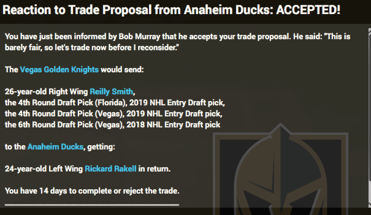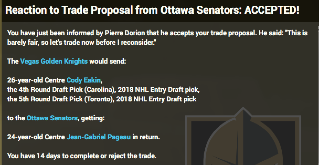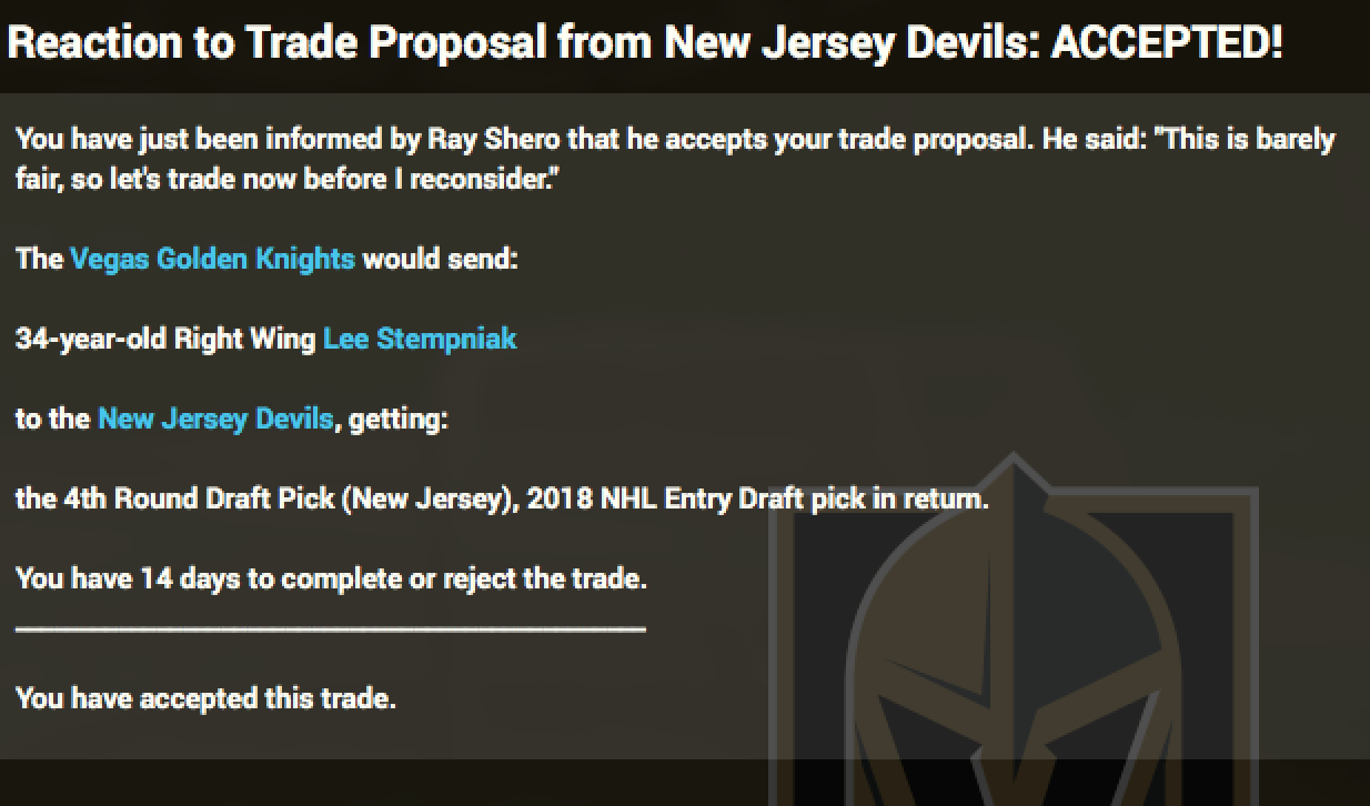 The Owner is satisfied with the progress made. The trade deadline has passed without the VGK doing anything, the most notable trade seen Calgary deal D Giordano to Montreal for C Drouin |