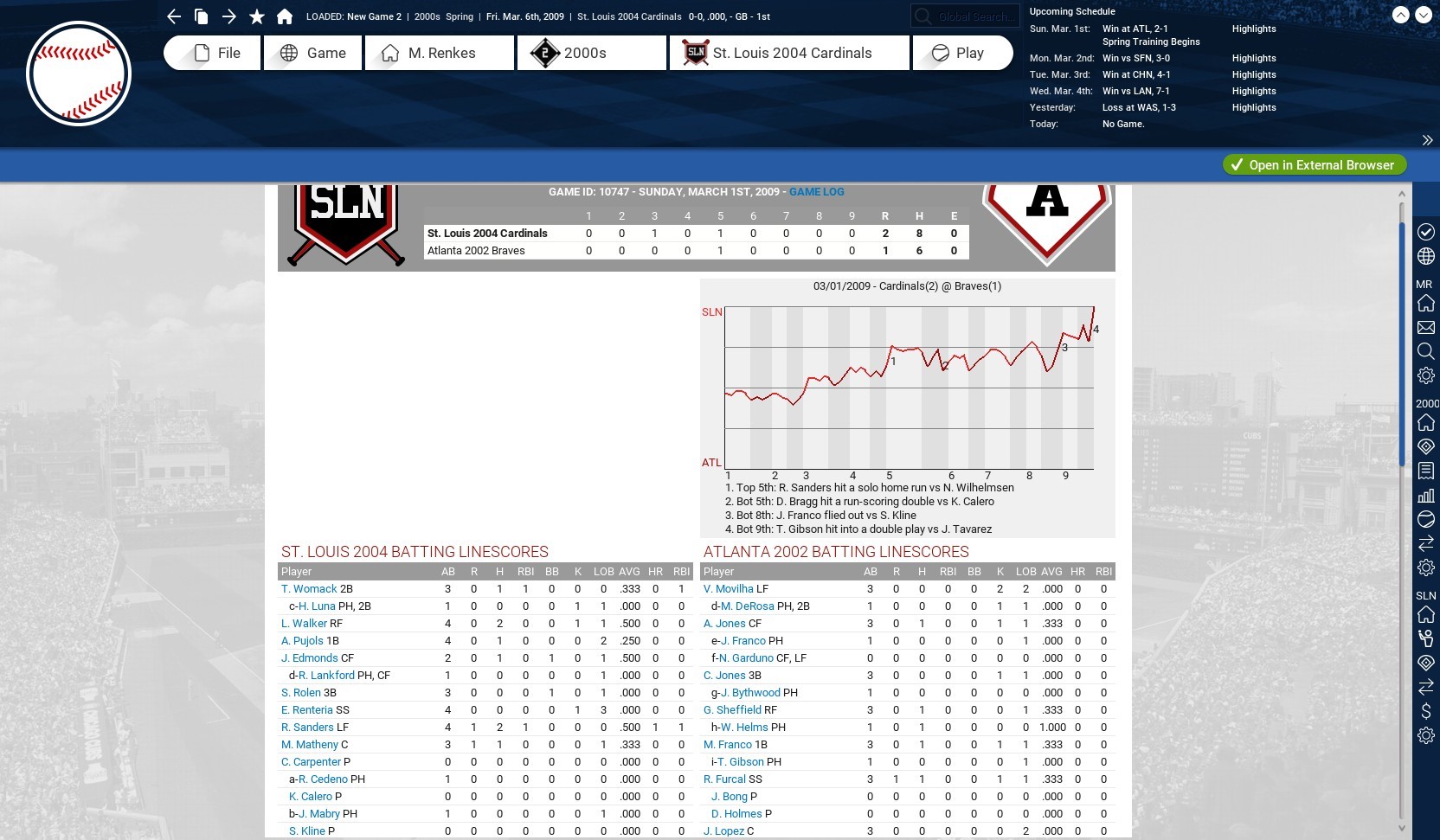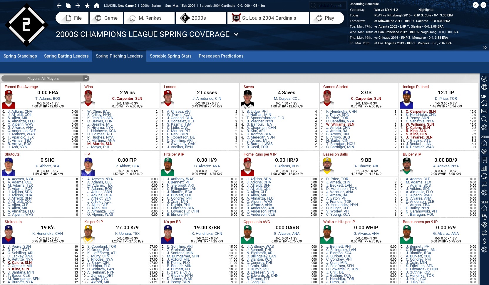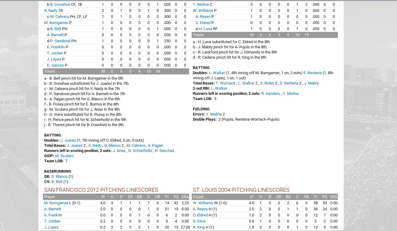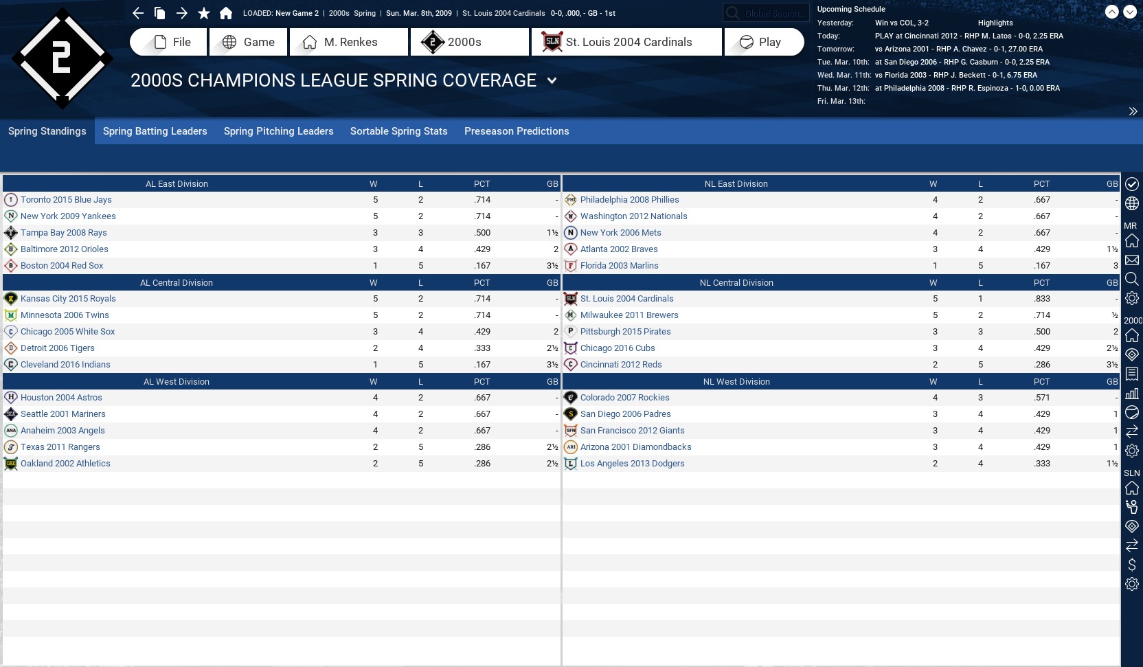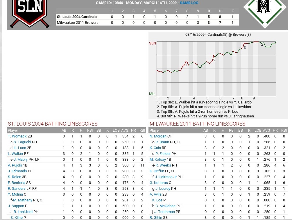 I am going to try a historical league featuring the top teams of the 2000s (2000-16). For the most part, each franchise will be represented by their best showing in terms of postseason advancement. Meaning World Series championship teams would be the first choice, followed by World Series runners-up, League championship series runners-up and so-on. Ties were broken based on regular season record. However, there are a couple of occasions where I have picked a team other than who should be the qualifier. I will give a brief explanation after the team list. The teams will play current major league rules, 162 games, with interleague play and World Series home field goes to best record. There will be no trades allowed, but the teams will have their minor league systems. American League East 2012 Baltimore Orioles 96-66 Lost division series 2004 Boston Red Sox 98-64 World Series champions 2009 New York Yankees 103-59 World Series champions 2008 Tampa Bay Rays 97-65 Lost World Series 2015 Toronto Blue Jays 93-69 Lost division series American League Central 2016 Cleveland Indians 94-67 Lost World Series 2005 Chicago White Sox 99-63 World Series champions 2006 Detroit Tigers 95-67 Lost World Series 2015 Kansas City Royals 95-67 World Series champions 2006 Minnesota Twins 96-66 Lost division series* American League West 2003 Los Angeles Angels 99-63 World Series champions 2004 Houston Astros 92-70 Lost NL championship series* 2002 Oakland Athletics 103-59 Lost division series* 2001 Seattle Mariners 116-46 Lost championship series 2011 Texas Rangers 96-66 Lost World Series National League East 2002 Atlanta Braves 101-59 Lost division series* 2003 Miami Marlins 91-71 --- World Series champions 2008 Philadelphia Phillies 92-70 World Series champions 2006 New York Mets 97-75 Lost championship series* 2012 Washington Nationals 96-64 Lost division series National League Central 2016 Chicago Cubs 103-58 World Series champions 2012 Cincinnati Reds 97-65 Lost division series 2011 Milwaukee Brewers 96-66 Lost championship series 2015 Pittsburgh Pirates 98-64 Lost wild-card game* 2004 St. Louis Cardinals 105-57 Lost World Series* National League West 2001 Arizona Diamondbacks 92-70 World Series champions 2007 Colorado Rockies 90-73 Lost World Series 2013 Los Angeles Dodgers 92-70 Lost championship series* 2006 San Diego Padres 88-74 Lost division series 2012 San Francisco Giants 94-68 World Series champions There are eight teams I went outside of the criteria for my choice. The 2006 Minnesota Twins fell in the division series but had a better record than the 2002 team which did. It also featured huge seasons from Justin Morneau and Joe Maurer. The 2017 Houston Astros were not available and I choose the 2004 team, which lost in the NLCS to the Cardinals, over the 2005 team, which got swept by the White Sox in the World Series, because Jeff Bagwell did not play as significant a role in 2005 and I wanted to see him in this league. The Astros were placed in the AL because that is where they currently play and it balanced the leagues. The 2002 Oakland Athletics fell in the division series but had a better record than the 2006 team which did. It also features Barry Zito, Mark Mulder and Tim Hudson at their peak. The 2002 Atlanta Braves lost in the division series but had a much better record (101 wins to 88) than the 2001 team which did. The 2001 team also features Glavine and Maddux in the rotation and Smoltz in the bullpen. Smoltz pitched in 2001, he closed in 2002, but was coming off Tommy John and was limited. The 2006 New York Mets had a better record (97-65) than the 2001 (94-68) and 2015 (90-72) teams, which both made the World Series. Its lineup also features Carlos Delgado, David Wright and Carlos Beltran with huge seasons. With a record of 105-57, the 2004 St. Louis Cardinals were a much better team than World Series championship teams of 2006 (83-78) and 2011 (90-72). They just happened to run into a freight train disguised as the Boston Red Sox in the World Series. A life-long Cardinals fan going back to the early 1970s, the best Cardinals team I have seen, including the Herzog era. The 2015 Pittsburgh Pirates (98-64) posted the best record of their three playoff teams in this era. They lost in the wild-card game to the Chicago Cubs. The 2017 Los Angeles Dodgers were not available for this league, so I went with the 2013 team that lost in the NLCS to the Cardinals. It did not have the best record (92-70) of their four NLCS qualifiers in this era, that goes to the 2009 team which went 95-67, but I liked the fact Kershaw, Ryu and Greinke went a combined 45-21 and Kenley Jansen had a 1.88 ERA out of the pen. I also was tempted to pick the 2002 San Francisco Giants just to get Barry Bonds into the mix, but I could not look past the three titles SFG has won in the 2010s. How I play: I will be managing/running the 2004 St. Louis Cardinals. I expect to play all 162 games. I sim the first five innings and play things out from there. I will try to post as many of my boxscores as I can and maybe league standings, league leaders, stats, emails and other important news at the end of the night. Feel free to comment or add suggestions. Last edited by rink23; 02-11-2018 at 05:34 AM. |