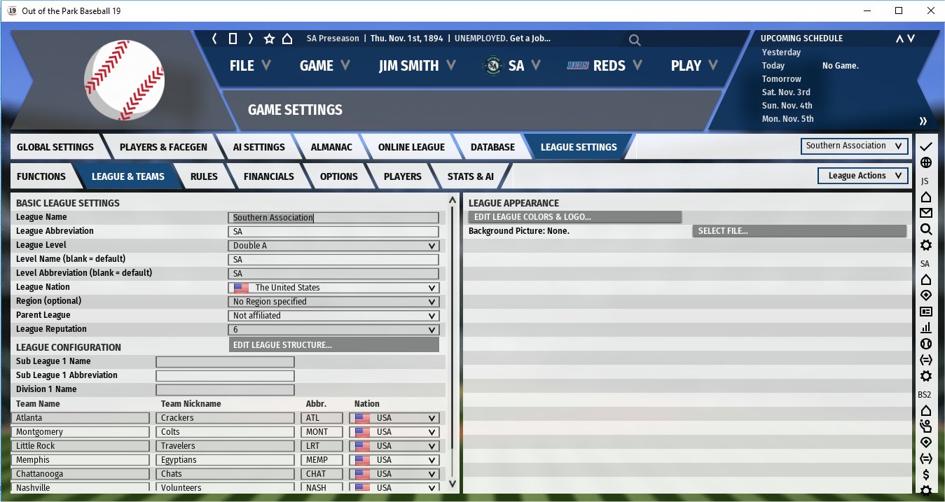 On September 4, 1894 after the import I check the free agent pool and there are 416 players. I can now easily add a minor league. It is not necessary but I sim forward until November 1 before I add my league. I do so to give the existing MLB teams time to sign any high quality rookie free agents. On November 1st there are now 276 rookies as MLB teams are now carrying about 40-45 players each. 276 free agents is more than enough to add an 8 team minor league. I am going to start with the Southern Association for this example. The first thing to do is go to the league setup screen for MLB and from the League actions dropdown select add a AA level feeder league. (You can choose any level. I use AAA for the PCL, IL and AA when I add them, AA for the Southern Assn and Western League and A for the Northwestern and New England Leagues.) Image STEP3 below shows the league I add. Once created I get a message saying the league has been added with a suggestion to fill the league with minor league players. Do not fill it with minor league players. We are going to get real players on our teams. I am now at the league & teams screen from League Settings for my new league. I only want 8 teams in my Southern Association so I start by clicking on Edit League Structure and then delete sub-league 2. I did not include screenshots for this but can if needed. Basically that now gives me just 8 teams in 1 sub-league for my Southern Association. Before leaving the Southern Association configuration screen I click on generate schedule because my league structure has changed so I need the schedule to reflect that. Once done go back to the league settings screen for the Southern Association. Lets go through each of the changes I make on the various league setup screens. LEAGUE & TEAMS I change the league name from MLB AA to Southern Association I change league abbreviation to SA I leave the league level at it's default Double A I choose to put SA in the level name and level abbreviations. By doing so on my player pages for league it will show SA instead of AA so I can easily distinguish between leagues when seeing where a player played. VERY IMPORTANT - I change parent league from Major League Baseball to not affiliated. Failing to do so will result in your league being deleted next season when the MLB and it's affiliates structure gets updated. For league reputation I tend to make my AAA leagues 8, my AA leagues 6 and my A leagues 3 so I set the Southern Association to 6. It is my understanding the higher the number (MLB is 10) the more likely top free agents will sign. I leave the sub league info blank as I only have the one sub-league and 1 division in my setup. I also change my team names, nicknames and abbreviations to the teams I will use in my Southern Association. SEE IMAGE STEP4 below