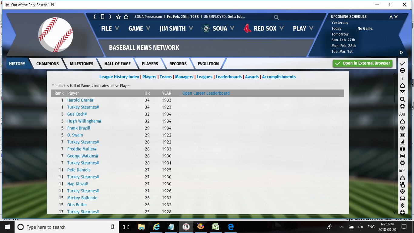 I will paste a text file below that I use to prompt me for name changes, folding etc of these minor leagues. One great thing I discovered in OOTP19 testing is if I fold my Southern Association at the right time it's history will carry over with the OOTP19 added affiliated Southern Assocation. It is pretty simple to do actually. All you have to do is know when the affiliated minor league Southern Association is added to the game (which is 1932). Other than that just make sure the playoffs for your 1931 Southern Association ends before the MLB World Series. Sometime between the end of the 1931 Southern Series and before the end of the World Series for that same year go to your league settings screen and delete the Southern Association. The affiliated Southern Association will be added when all of the rookies and minor leaguers are created for 1932 which is the end of the final day of the 1931 World Series. Unfortunately team totals don't carry over as the affiliated teams are treated as new franchises but all player records and leaderboards do. Below is an example with the Southern Assocation from my recent test league from 1894-1938 One thing you will notice on the leaderboard is the name Turkey Stearns. Because the created minor leagues are unaffiliated there is no color barrier for them so many of the great Negro players from the 1910's now have a place to play. It can be considered a drawback as well because it will somewhat weaken your Negro League clubs as many players will stay in the unaffiliated leagues until they are forced out when they fold. I guess it is up to the user but I like the idea just because without the fictional minor leagues many of the early Negro greats never get to play anywhere or are at the tail end of their careers when the Negro League finally appears in OOTP. (Note: Turning color barrier on is only possible in OOTP with pre 1946 MLB and it's affiliated leagues.
