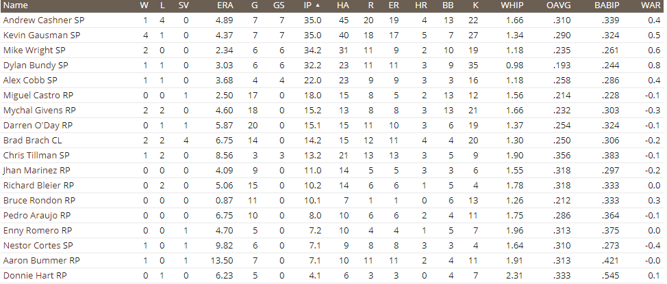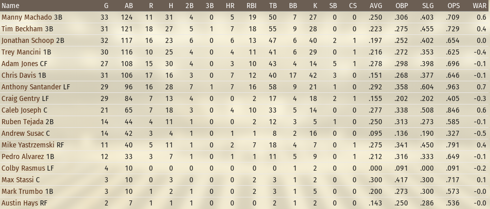Adam Jones left with an oblique strain, and will head to the DL. I'd recall Mark Trumbo from his rehab assignment to take his place. Jones should miss just 10 days. Cashner went 4.2 with 9 hits, 4 runs (3 earned), 3 walks, and 3 strikeouts. The rest of the pen combined for 5.1 innings with 5 hits, a walk, and 8 strikeouts. Brad Brach earned the win, 2 innings with 2 strikeouts. Davis launced two homers, a 2-run homer in the 9th and the walk off homer, in a 3-for-4 game where he also walked. Jones was 2-for-3 with a double, 2 walks, and run scored before getting hurt. Ruben Tejada was 1-for-3 with a run scored and a walk. I also earned the achievement "Walk Off" for Davis' walk off. Whit Merrifield's streak was ended at 20 games today in a 8-2 loss to the White Sox. I wanted to claim an outfielder off waivers, but both Leonys Martin and Cesar Puello were hitting below .110, so even the struggling Craig Gentry was a bit better. April 28th, 2018: Game two saw Dylan Bundy (1-1, 1.61 ERA, 0.93 WHIP) take on Jordan Zimmermann (2-1, 5.09 ERA, 1.17 WHIP). We scored 3 in the 9th to take the second game 11-9. Caleb Joseph hit a three-run homer to win the game. Bundy had a rough outing, allowing 6 runs and 5 hits in 4.2 innings with a walk and 8 strikeouts. Mychal Givens allowed 2 in 1.1 innings with a walk and 2 strikeouts. Brad Brach earned the win, despite allowing a run, walk, and 2 strikeouts in the 9th. The hero Joseph was 2-for-4 with an RBI double and walk to go with the game winning homer. Chris Davis was 2-for-5 with a solo homer and a double as he's actually hit the ball recently. Tim Beckham was 2-for-5 with a double, homer, 2 runs scored, and 2 RBI's. Trey Mancini was 2-for-4 with a double, walk, run scored, and an RBI. Jonathan Schoop was 2-for-5 with 2 runs, an RBI, and a double. April 29th, 2018: I claimed C Max Stassi off waivers and optioned C Andrew Susac to AAA. Stassi is hitting .250/.318/.350 in 20 at bats with the Astros. He's also a really good defender behind the plate. We looked to finish the sweep with Kevin Gausman (4-1, 3.48 ERA, 1.16 WHIP) taking on Matt Boyd (0-3, 3.81 ERA, 1.06 WHIP). A lot of late early scoring saw the game tied 6-6 after the 5th. It went into extras, and the Tigers got 1 in the top, before we answered with another in the bottom. They scored another in the 11th, but we got two to finish the sweep with a 9-8 win. Gausman was hit hard, 6 runs (5 earned) with 10 hits in 4 innings with a walk and 2 strikeouts. Enny Romero pitched 3.2 innings, allowing 4 hits, 2 runs, 5 walks, and 2 strikeouts. Bruce Rondon struck out the side in the 7th, but walked one and allowed a hit. Givens got the win, walking a hitter and getting a strikeout to end the 11th. Tim Beckham was 2-for-6 with a double, homer, 2 runs, and 3 RBI's. Mark Trumbo was 2-for-6 with a double, run scored, and 2 RBI's. Stassi was 2-for-3 with an RBI in his Orioles debut. Ruben Tejada was 1-for-2 with a run scored, walk, and double. Ben Gamel hit for the cycle in a 13-3 win as the Mariners topped the Indians. We got tomorrow off, and would travel to Los Angeles. April 30th, 2018: We're an impressive 10th in the Power Rankings as we evened our reord at 15-15. Looking ahead to the series with the Angels, we'd see Matt Shoemaker (1-2, 6.51 ERA), Shoehi Ohtani (0-2, 5.22 ERA), and Garrett Richards (2-0, 3.30 ERA). May 1st, 2018: SP Michael Baumann was named South Atlantic Pitcher of the Month. He was 3-1 with a 1.42 ERA in 5 starts with 31.2 innings and 20 strikeouts. Shoehi Ohtani (0-2, 5.22 ERA, 1.50 WHIP) jumped a spot in the rotation against Mike Wright (1-0, 2.20 ERA, 1.19 WHIP). We scored 3 in the 1st, and it was enough to win the opener 6-2. Anthony Santander left with wrist soreness and will miss 2 weeks. Wright allowed 6 hits and 2 runs in 6 innings with a walk and 5 strikeouts. Jhan Marinez and Darren O'Day earned holds, and Brach pitched the 9th despite the lead. Tim Beckham was 2-for-5 with a solo homer. Jonathan Schoop was 1-for-3 with a double, run scored, RBI, hit by pitch, and a walk. Mike Yastrzemski was 1-for-4 with a solo homer. Trey Mancini was 2-for-4 with 2 runs scored. May 2nd, 2018: I recalled Austin Hays from AAA for a few days before Adam Jones comes off the DL. Hays hit 7th and played RF as Alex Cobb (1-0, 2.55 ERA, 1.08 WHIP) took on Matt Shoemaker (1-2, 6.51 ERA, 1.34 WHIP). The pitching fell apart, and we dropped the middle game 7-1. Cobb allowed 4 runs in 4.1 innings with 5 hits, 2 walks, and 2 strikeouts. Jhan Marinez gave up 2 hits and 2 runs without getting an out. Miguel Castro allowed a run in 1.2 innings with 2 walks. Rondon tossed 2 scorless with a hit, 2 walks, and a strikeout. Manny Machado was 2-for-4 with a solo homer. Tim Beckham was 1-for-4 with a double. Jonathan Schoop was 2-for-4. May 3rd, 2018: We finished the series in Anaheim with Andrew Cashner (1-3, 4.80 ERA, 1.70 WHIP) facing Garrett Richards (2-0, 3.30 ERA, 1.30 WHIP). The Angels got three in the first, and took the finale 6-1. Cashner went 5 innings, with 5 hits, 3 runs, 2 walks, and a strikeout. Mychal Givens was charged with a run in 1.2 innings with 2 hits, a walk, and a strikeout. Darren O'Day allowed a hit, 2 runs, and a walk while getting just a strikeout. Tim Beckham was 3-for-5. Hays was 1-for-3 with a double, run scored, and walk. Mike Yastrzemsnki was 1-for-3 with a RBI and walk. We're off to Oakland for three with the 13-18 Athletics. We'd see Kendall Graveman (2-2, 3.25 ERA), Andrew Triggs (1-3, 4.85 ERA), and Sean Manaea (2-3, 4.75 ERA). Below are our stats to start the year: |