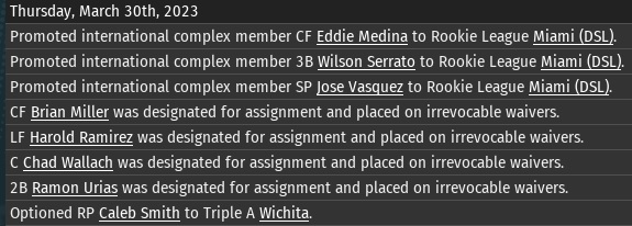 So... Miami DFA'd Caleb Smith. He had already been optioned this season, so if they needed room on the 26 man roster, he could have been sent to minors.