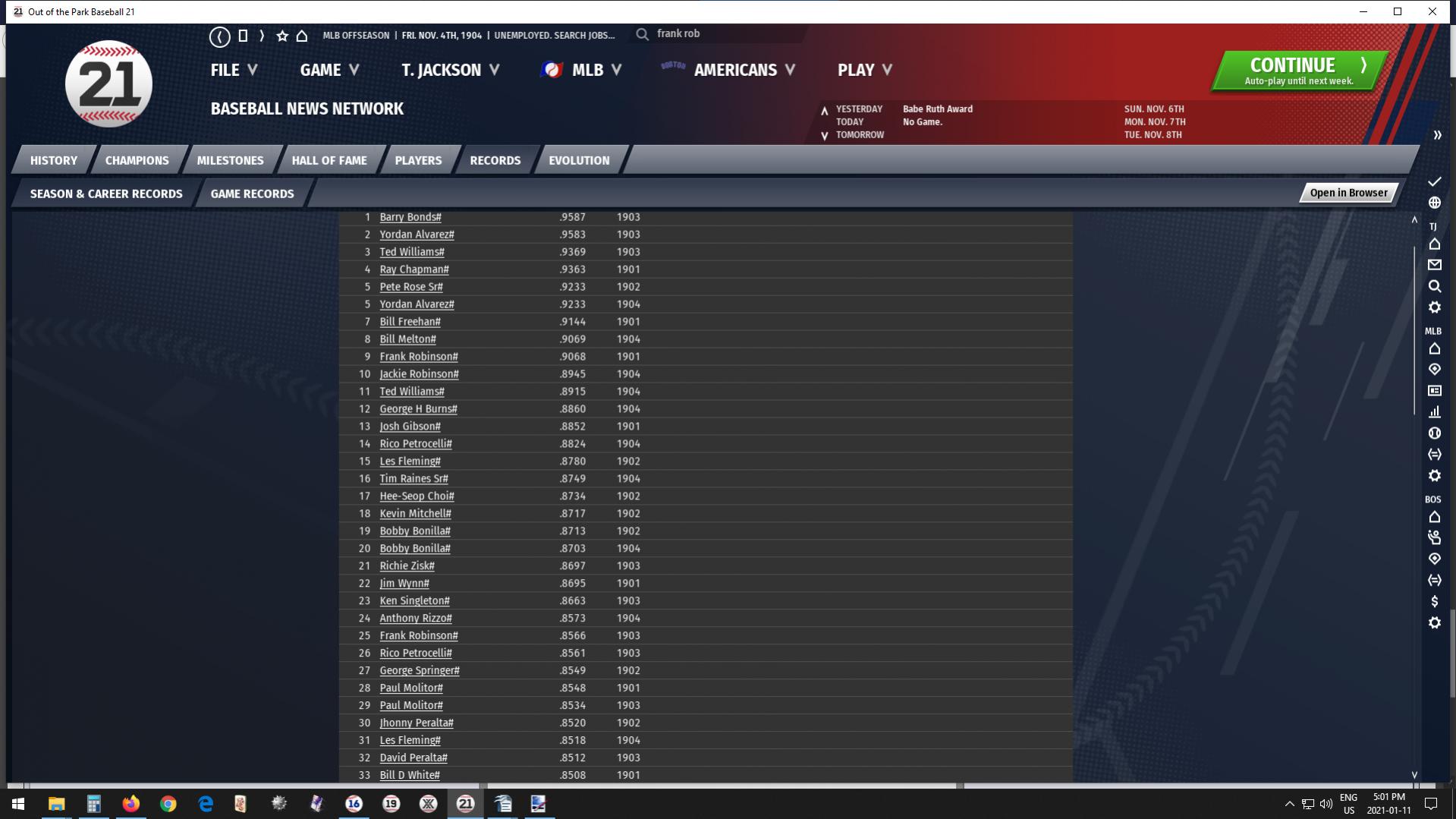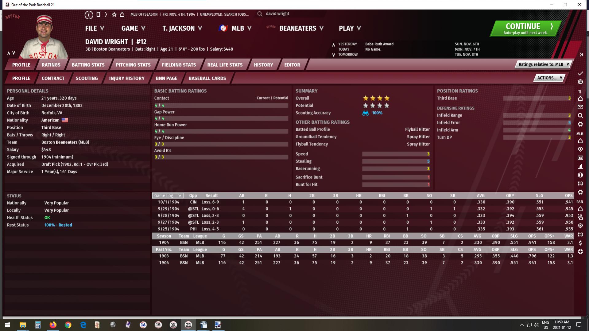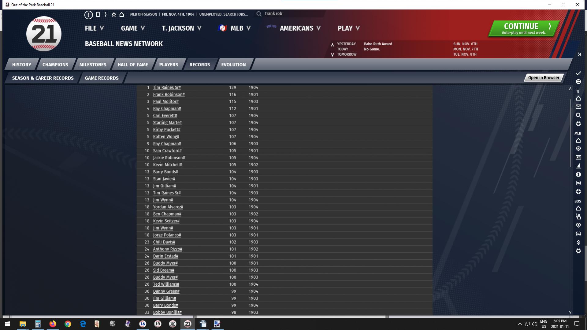I've only really started to put the pedal to the metal on this one very recently. I'm pretty much down to controlling the amateur draft, and who gets into the HoF. Reluctantly let go of controlling the awards and who goes to the ASG, despite the fact that I'm not a big fan of how the AI does either. If I was going to make any progress though, I was going to have to sacrifice some things. Absolutely could not relinquish control of who gets drafted when, and bestowing the highest honour on those that warrant it. For the draft, I use the Hall of Stats rankings, and create draft values based on a player's ranking among his close to 20,000 peers all-time. I just do them in reverse order of the ranking all the way down to 1 for poor ole Bill Bergen. Currently, the Hall of Stats runs through 2019, so it lines up perfectly with OOTP21 in terms of historical stats. I hope the site's creator, Adam Darowski is OK, because he hasn't posted in almost two years, and hasn't updated the numbers through this past truncated season. It's a great site, and I encourage anyone (even the "WAR...What is it good for?" crowd) to check it out, and see how it matches up with their opinions on the quality of players' careers. What follows is a short series of posts on leaders in various categories in the four seasons so far (1901-1904), as well as interesting goings on in the league. Hopefully I can push this thing forward, and get to the point where I have a HoF. My previous record was a 63 season league in OOTP16 (1901-1963), which featured 74 HoFers. Looking for more this time, and hopefully pulling back a bit on my OCD tendencies, will help me get there. If you have a category you'd like to see the leaders for, both in single season, and in career rankings, let me know and I'll post it. Anything else you want to see, just give a holler. |