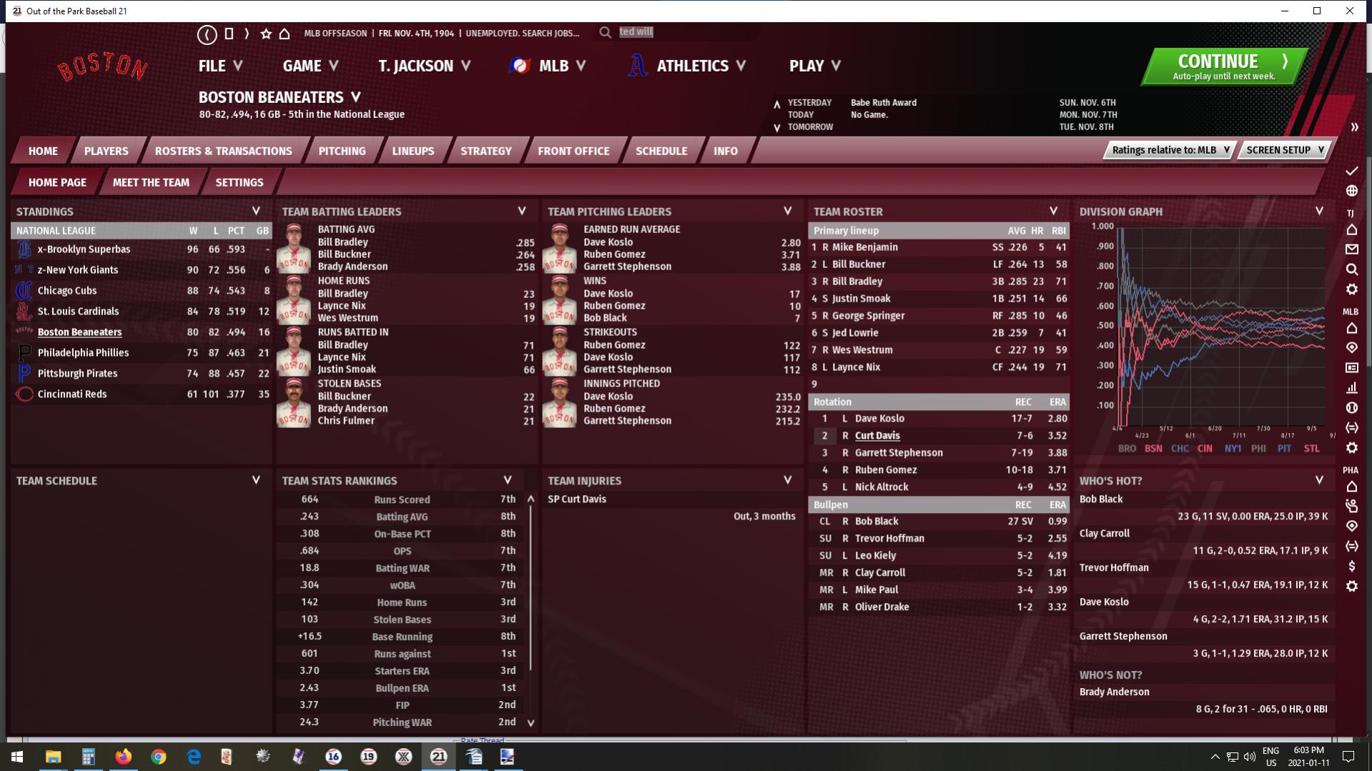 The Brooklyn Superbas rotation had a very sweet season on the way to 96 wins and a World Championship. Looking at the names, I'm not sure they're built to last, but everything clicked in 1904. The Boston Beaneaters bullpen was nuts. Trevor Hoffman as a setup guy? Clay Carroll as a middle reliever? Well...Yeah. Rookie Bob Black went 7-2, 27 SV, 0.99 ERA, 0.93 WHIP, and 12.0 K/9. Look at the Who's Hot column off to the right to see how Black, Hoffman, and Carroll performed down the stretch. Sadly, the team wasn't in contention, but that's a tremendous performance by the 'pen.Yes, Black's a 19th century pitcher Mr. Watts, and yes, we've discussed the perils of allowing them into our games before, but I can't let go of the Cap Ansons, the Charlie Bennetts, the Deacon Whites, the Ross Barnes' etc etc, and so I put up with the aberrations of the pitchers of that era. I use strict rotation mode to keep the SP innings leaders in the 260-270 range, which works for me, even if it's unrealistic to hold back the horses of that era. It does mean your 5th SP has to be more than a mere afterthought, which also provides a challenge I s'pose. Pics below: Last edited by actionjackson; 01-11-2021 at 11:41 PM. |