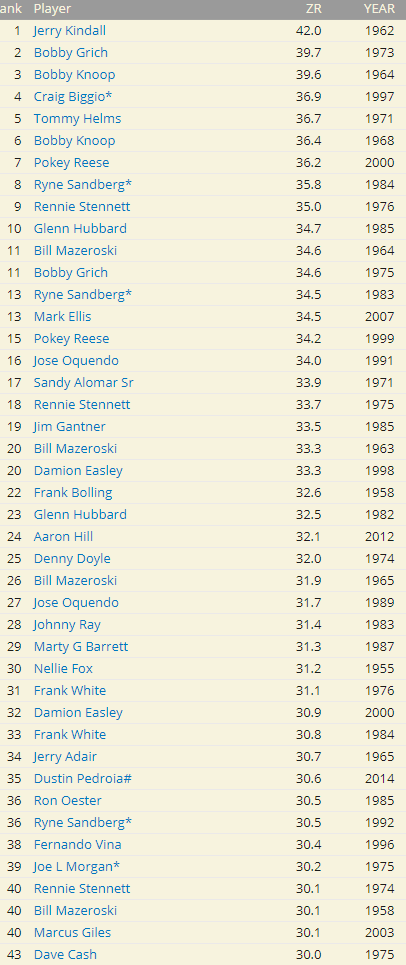 Since 1954 there have been 38 instances of a SS with a Zone Rating of 21 or more, with the most being Adam Everett with 40, nd there were only 3 other instances of a player above 30 in a season. In OOTP there were 100 instances of a SS above 38 in a season. Ripken had a 75 Zone Rating in 1984 in the game. |