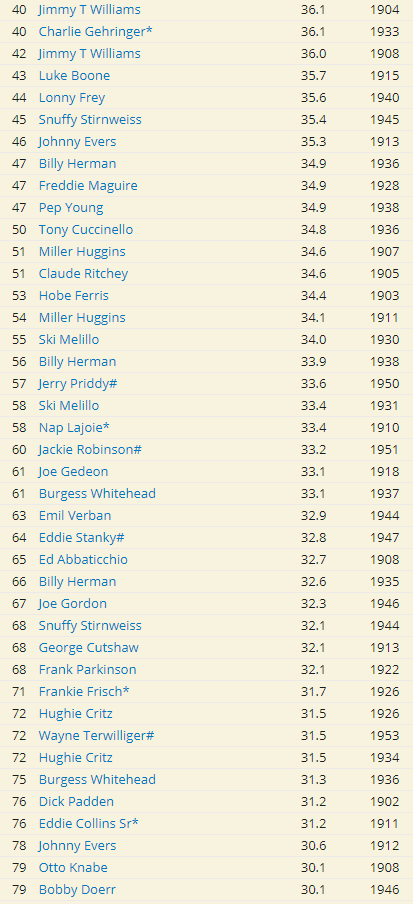 This is the top 40 for SS career on Baseball Reference compared to in OOTP for the 1954-2019 seasons.