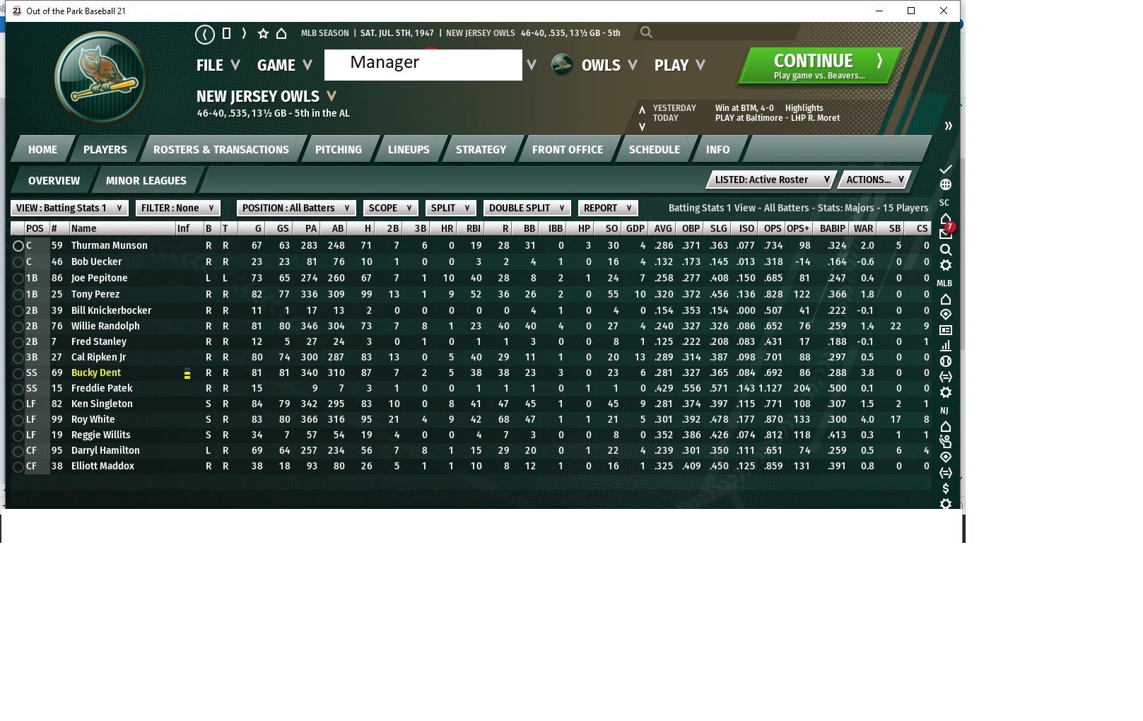 Nice that you have Fred Stanley as Dent's backup just like in RL--defense helps. I hope I have as much energy as Fred when I am 70 years old. He will be 73 this year and still works for the Giants.