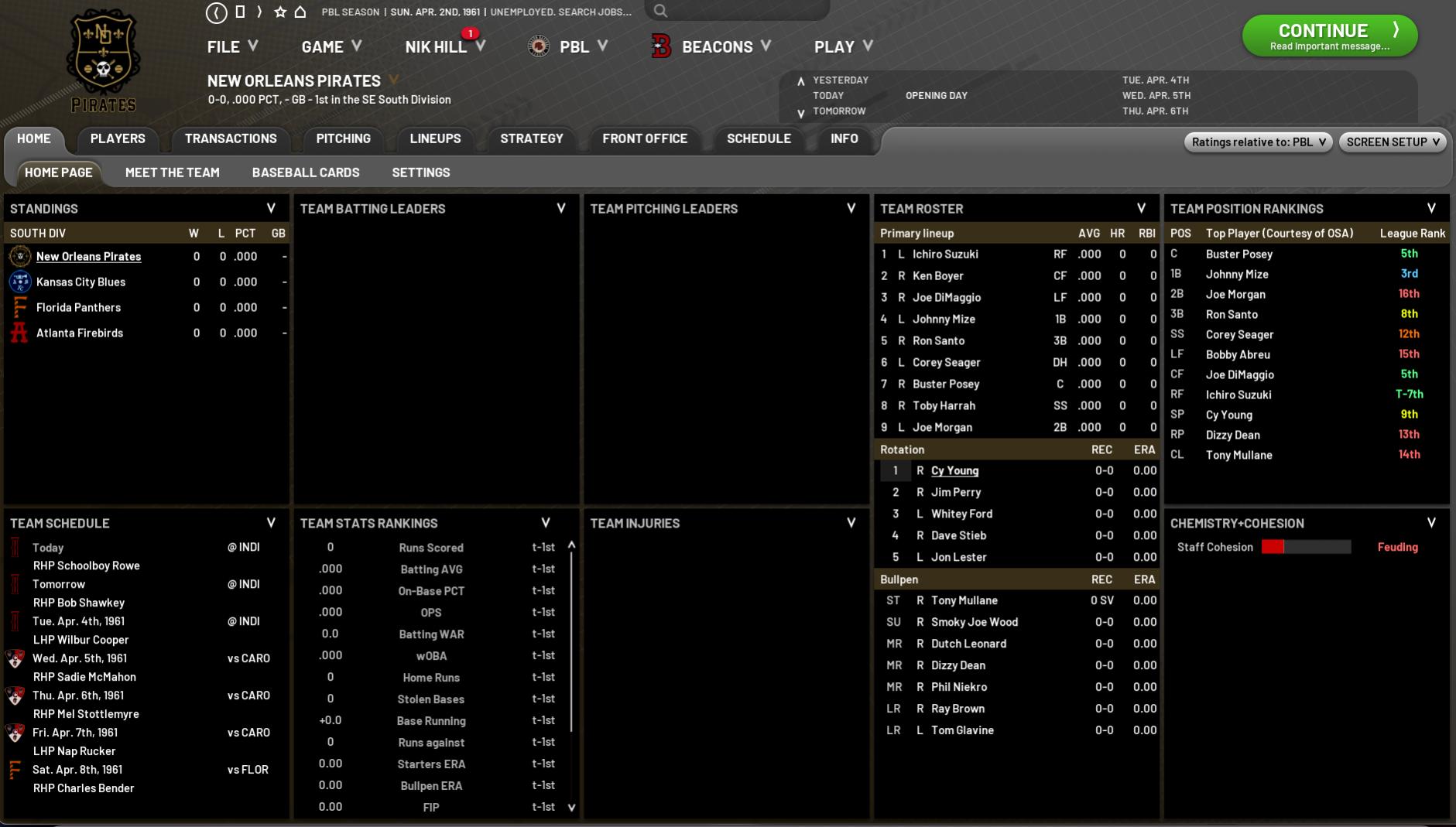 This looks like a team that will start competitive and stay that way throughout. McCovey is ready to rock and roll. Bellinger showed in Spring Training that he’s ready to match it with the big boys. Cabrera and Dahlen also seem likely to star from the off. Then they have Gehrig, Greenburg and Snider all projecting to be the superstars one would expect them to be. If their pitching starts off light, it is unlikely to stay that way for long – not with Alexander, Roberts and Gibson as their top 3 and a bullpen led by Eckersley. To round it off nicely for the Blues, they are up there with the best defensive units in the league. I am eagerly anticipating the yearly battles between KC and Atlanta, which is shaping up to be one of the PBL’s fiercest rivalries. 1961 PREDICTIONS RECORD: 92-76, 2nd in South, 2 GB HITTING: .262 / 89 HR / 763 R / 199 SB PITCHING: 4.01 ERA / 916 K / 750 R / 490 BB