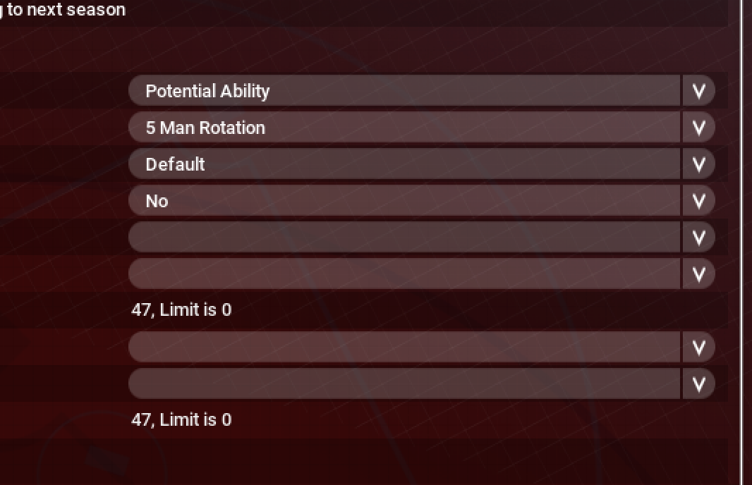 Go to the rules area of the KFL league setting. Set it to 50....then go to the "stats & AI" section, and select however many batters and relief pitchers you want. Then go back to the rules section and select from 50 back to unlimited. Then go back to the stats and AI tab again, and you should see this: |