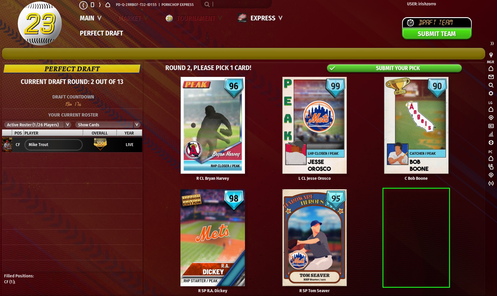 During draft tonight on two separate occasions, I had a blank card show up on the page that was selectable but invisible. If you select it and accept, an error shows up and card is not on your team and you have to refresh and select another. This happened during two tournaments and one of them happened on multiple pages.