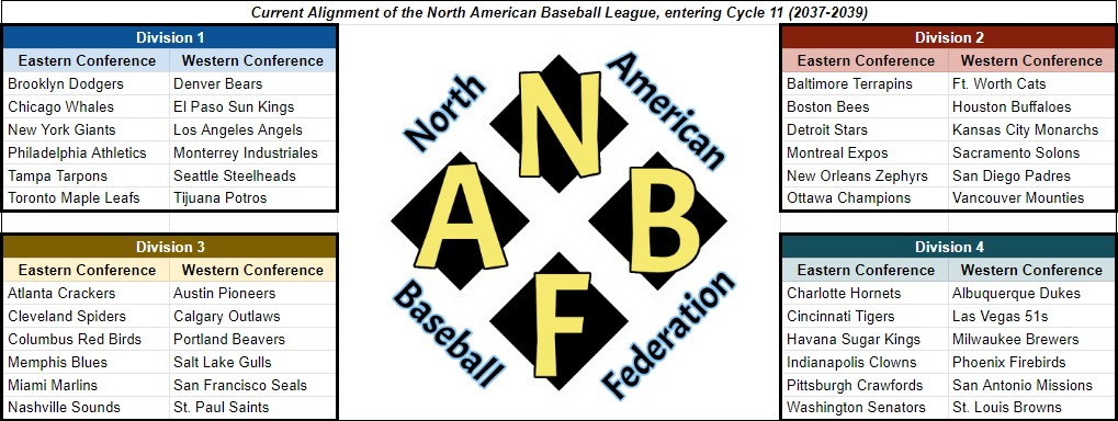 Finally, a consortium of small and mid-sized market teams offered a choice: either accept a radical merger and realignment, or clubs would be forced to fold and entire leagues would collapse. The result was a dramatic merging and restructuring into a Federation: four primary Divisions, each split into eastern and western Conferences, which connected to each other using promotion and relegation for the most and least successful clubs. Teams would be assigned at first based on market size, with the largest market teams occupying Division 1, and the smallest in Division 4, with the goal of promoting more even competition. Over the summer of 2006, while regional leagues were continuing play, owners, player representatives, executives, and others came together to hammer out the details. Some of that debate focused on the team assignments themselves: in order to obtain better placements, some geographically-close teams negotiated for mergers, while others argued over the precise definitions of their media markets. The biggest of these debates centered on the Brooklyn Dodgers, who maintained that they should be credited with an equal share of the New York market with the rival Giants; in the end, league leadership agreed, allowing Brooklyn entry into Division 1. The ownership of the San Diego Padres publicly called for a merger with their southern neighbors in Tijuana, a proposal that was considered but ultimately rejected; similarly, the El Paso Sun Kings argued - in this case successfully - that the Mexican city of Juarez be considered part of their media market, allowing the Sun Kings to become Division 1 members. The final meetings, in August 2006, revealed operational details. Divisions would share a player and draft pool, schedule length, and ruleset. At the close of each season, Conference winners would meet for the Division Championships to end the season. There would be no cross-divisional play or postseason; though larger market teams argued in favor, a majority of clubs decided to keep all play, including ultimate seasonal championships, separate. This allowed smaller market clubs to establish themselves, and to find postseason success, on their own terms: fans always saw competitive level baseball, and that mattered. League founders also wanted a league that rewarded long-term building rather than short-term sprints to promotion, so they devised a system wherein promotion or relegation would be done every three seasons, rather than annually. Promotion and relegation would be governed by a formula. Though the formula has been adjusted over the years, the core concept has remained the same: three-year winning percentage, with the most recent season carrying the most weight; number of first and last place finishes, and number of Conference Championships. After three years, one team from each division would move up, and one from each would move down, based on the points awarded by the formula. The result, over the 30 years of Federation history, has been an association that has seen a mix of stable dominance and dynamic movement, while providing small market teams with the chance to see seasonal and postseason success - indeed, some of the most successful teams in league history (the Baltimore Terrapins, for example, or the Columbus Red Birds) have emerged from Division 4 to climb high into the ranks of the Federation. Others have seen their fortunes fade in similar ways. This series will serve to summarize the first 30 years (10 cycles) of NABF play in a few ways: first, an overall survey of the major trends over that period; then a ranking of all 48 teams with discussion of team histories; and finally a look at the greatest individual players the league has produced. Once complete, the series will continue as a cycle-by-cycle recap of NABF action. Last edited by ArquimedezPozo; 12-23-2022 at 10:29 PM. |