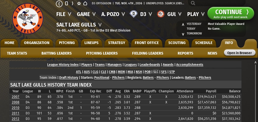 It’s Saturday, October 11, 2025, the second to last day of the 2025 NABF season, and there are four games on today. At 1pm, you watch Game 6 of the Division 4 Championship series; it’s been a good one, with the Albuquerque Dukes leading the Charlotte Hornets three games to 2. It’s a tight contest through 7, but now the Dukes have the bases loaded, though they’re a run back of Charlotte. There are two outs, but the light-hitting shortstop Steve Willis is up; he’s only had two singles during the series and has struck out 7 times. The count runs to 2-2. Then, a fastball, away. Willis lunges and manages a bloop down the line - it’s fair! It bangs against the corner where the wall juts out and scoots just far enough to elude Charlotte LF Xenophon Korkoris. With one run already in, the runner at second is now being waved around - with two outs, he’d been off on contact, and now he dives, his hand sweeps over the plate as the tag comes in, and he’s safe! Albuquerque has taken the lead! They score twice more that inning, and it’s sewn up - Albuquerque takes the title in six. You flip over just in time to catch the 4pm first pitch for Division 3’s Game 7. Another tight contest - this one a smashfest. You didn’t really have a rooting interest in D4’s ALB-CHR, but this one has a David and Goliath feel to it: The Padres are looking for their fifth Championship, and second straight after promotion from Division 4 in the offseason, while Ottawa - long one of the most hapless teams in the Federation - is here for the first time. You like an underdog, and they’re certainly that, but at the moment it doesn’t look great - after a few lead changes and almost as many pitching changes, San Diego is up by two heading into the ninth. We’re in Ottawa, though, so when ace Champions reliever Doug Klutz wraps up a scoreless top half, Ottawa’s top of the order comes due. Ottawa got here through pitching and defense, but they’ve turned on the power so far this series, so it feels like there’s a chance. When CF Nick Washington leads off the bottom half with a solo shot, the Ottawa crowd erupts, and no one sits down for the rest of the game. #2 hitter Herb Phillips Ks, and Frank Flanigan grounds sharply to third, but then the great Josh Randall steps to the plate. Randall signed with Ottawa in the offseason, as good a place as any to end a career, and then he found himself along for the ride. Randall has never won a Championship, and he wants it bad - he lines a single to the opposite field. Another single, this time from the speedy young 2B Lorenzo Escobar, and suddenly Ottawa has the winning run on first. Randall is lifted for a pinch runner as Josh Henry comes to bat. Henry is just 25, and didn’t even play a full season for the Champs, but was electric in the second half, and the crowd senses it. Henry doesn’t make them wait, turning on the first pitch and sending deep, into the RF corner - it misses a homer by inches and rolls toward the right fielder Gonzalez. One run is already in, and Gonzalez comes up firing but it’s too late! Escobar crosses home standing up, into a pile of his teammates - the Champions are Champions, and in walk-off style! The exhilaration of that win almost makes you forget that the D2 Championship game 6 started at 7 - it’s already well into the third when you flip over. The Baltimore Terrapins had won an astonishing 115 games in 2025, easily the most in the Federation’s history, and their victory over Vancouver seemed an almost foregone conclusion, but they’d dropped the first game in Baltimore and had narrowly won the second. The Mounties crushed Danny Rzasa in Game 3, but the Pins came back to take the 4th and 5th, and now stood on the precipice of becoming the first team with championships in three different Divisions… but as you tune in, you see a 5-0 Mounties lead, already. This time they’ve victimized Martinez, who was brilliant in Game 2 but is on the ropes here. The Mounties add two more in the 5th, and another in the 6th; a Steve Mauck solo shot eases the pain in the 7th, but not by much. The Division 1 game is starting up soon, and you figure you can flip back here and there - if the Pins come back somehow, you’ll catch it. They don’t, and you watch the Philadelphia A’s take all the drama out of their own Game 7, vanquishing El Paso 6-2 after a two homer performance by 1B Jake Haston - he hit two earlier in the series and is an easy selection as series MVP. You watch until he finishes his quick shoutouts, hoisting the MVP trophy while his teammate, the great catcher Corey Cerrone, holds the championship cup behind him. Then you switch it off and head to sleep. So now it’s October 12, and only one game remains between baseball and the offseason: a Division 2 game seven between the best regular season team in NABF history, and a Mounties club whose 94 wins are hardly nothing, but still pale in comparison to that juggernaut. Or so people have said, anyway: here they are, now, one win away from an upset victory over a superteam. And it’s Rzasa, again: he’d had a terrible Game 3, which, if repeated, could mean a long offseason in Baltimore. Rzasa hadn’t lasted past the second inning in Game 3, but in Game 7 he manages four plus before exiting, his Terrapins leading 6-4 after a Doug Padgett bases-clearing double in the third off promising young starter Danny Pierson. Philadelphia’s manager will take heat for starting the youngster in this series, you think. Padgett has given the Pins an extraordinary series so far, but once Rzasa left things have gone awry, and it looks like that effort might be wasted as Vancouver drops two on Baltimore’s pen in the seventh, tying it up. In the eighth, they finally get to David Linder, who has handcuffed them in four scattered innings over the rest of the series, and entering the ninth it’s 7-6 Vancouver. Baltimore closer Matt Heitzman sits Vancouver down in order, as he has all 