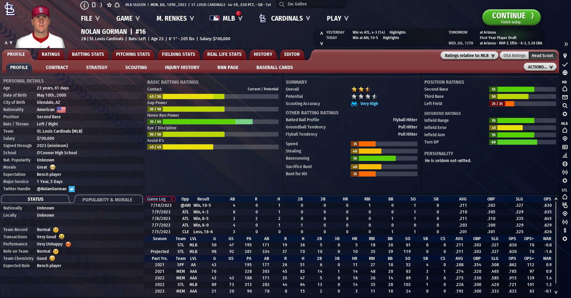 Way back in 2017, the St. Louis Cardinals made a deal to acquire outfielder Marcell Ozuna from the Miami Marlins in exchange for starting pitchers Sandy Alcantera and Zach Gallen and outfielder Magnerius Sierra. Ozuna had a couple of decent seasons at the plate for the Cardinals -- but was a butcher in the outfielder -- and left after the 2020 season to sign with the Atlanta Braves. Where he has made more headlines for domestic abuse and driving under the influence than anything he has done on the field. Alcantera blossomed into a star with the Marlins culminating with a Cy Young season in 2022 where he went 14-9 with a 2.28 ERA. Gallen, meanwhile, was traded by the Marlins to Arizona in 2019 and also has turned out to be a top-flight starter. In the 2023 season, in which I am playing at the Cardinals, he is 10-3 with a 2.59 in mid-July. Well, on July 10, the Cardinals are 44-39 and lead the Brewers by 1.5 games in the NL Central. The division looks very winnable, but competing against the other heavyweights in the National League looks like a uphill climb. We need a top of the rotation starter and the Marlins want to get rid of Alcantera. His season has not been good -- he is 5-10 with a 5.46 ERA in 18 starts -- but he also is upset with the team's record and his own performance. His pitch ratings also are not (50 stuff, 50 movement, 60 control) what you would expect for a pitcher coming off a Cy Young season. He is very gettable. (Money isn't an issue, he fits within my budget). Nolan Gorman or Brendan Donovan would complete the trade. Both are seriously underperforming. Should I pull the trigger or is this me fleecing the game. I always wonder what other players would do in the same situation. Last edited by rink23; 01-27-2023 at 07:15 AM. |