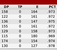 8. DENTON CITY: after being in the first division four years in a row, the Redbirds tumbled all the way down to the TU West basement and last place (30 GB)... it was a dismal season... in the team's early history they made the playoffs eight times in their first 12 years in the IPA... twice the Redbirds made the Pro Cup Finals, but twice they came out on the short end... Denton City was terrible at the plate and not a lot better on the hill... superstar 1B Wayman Stetson is the only talent on the team... Stetson was the club leader with a .301 BA, 186 hits, 38 homers, 84 RBIs and 80 runs... no one else approached his numbers... 28-year-old Harry Elliott (19-20/3.49) and ancient 41-year-old Francisco Salcido (13-18/3.38) were the most reliable pitchers.
