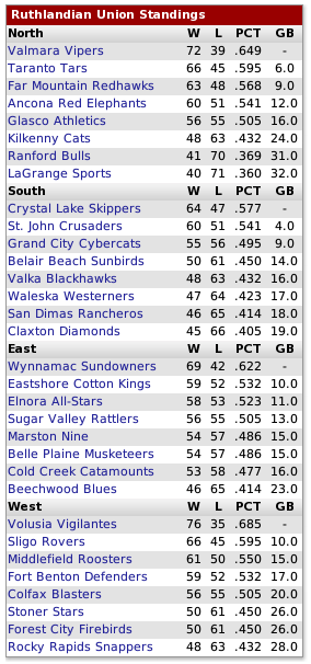 After 4 months of play in the Islandian Pro Alliance, the pennant races are still tight in the Tycobbian Union, but the Ruthlandian Union leaders have gotten some breathing room... Wynnamac (69-42) and Volusia (76-35) have forged 10-game bulges in the RU East and RU West, while Crystal Lake (64-47) is 4 games up in the RU South over second place St. John (60-51) and in the RU North, Valmara (72-39) has a 6-game margin over Taranto (66-49)... over in the Tycobbian Union the leaders are bunched tightly... in the TU North, Luxora (64-47) has a 1-game edge on runners-up Oxford (63-48) and North Hills (63-48)... Midway (66-45) is now only 1 game ahead of Pro Cup champion Red Bluff (65-46) in the TU East... Arlon (66-45) has taken over the lead in the TU West... the Champions are 2 games ahead of Chicopee (64-47) and 7 games better than Rolling Hills (59-52)... in the TU South, the Southport Sun Sox (66-45) top second place Turon (63-48) by 3 games.