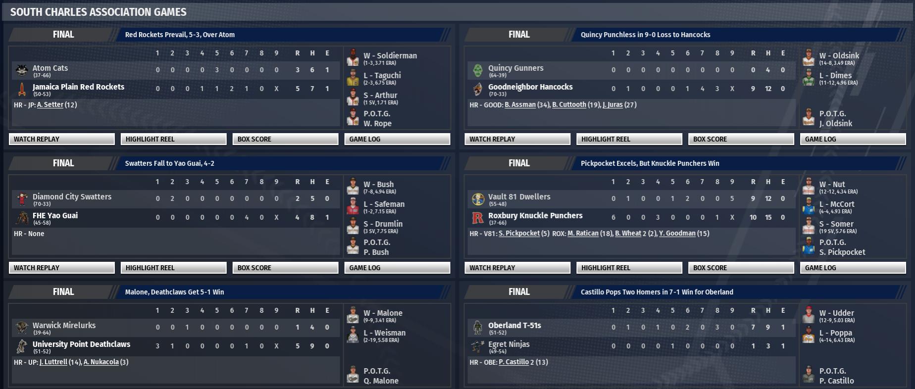 Vault 81 got a terrific game from left fielder Skyler Pickpocket. It wasn't enough, though, to prevent the team from falling to Roxbury, 10-9. Pickpocket was 4 for 4 with a home run, a double, 2 singles, and a walk. He drove in 5 runs and scored once. Beachboy Nut picked up the win, improving his season record to 12-12. He struck out 7 in 7.2 innings. The Knuckle Punchers raised their record to 37-66.