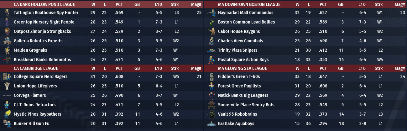 Goodneighbor (#2) is still the CBO’s best team, record wise, but the hot Stags drop them down a notch. The Hancocks did not have a great week, going 2-3, with a sweep loss to Diamond City (#6, 5-0 this week) and a 2 out of 3 weekend over