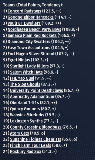 Vault 81 (#3) also jumped up in the rankings thanks to a 4-1 week, with just a Sunday loss against Oberland (#16). Otherwise, the Dwellers beat up on Quincy (#17) and won the first two over the T-51s.