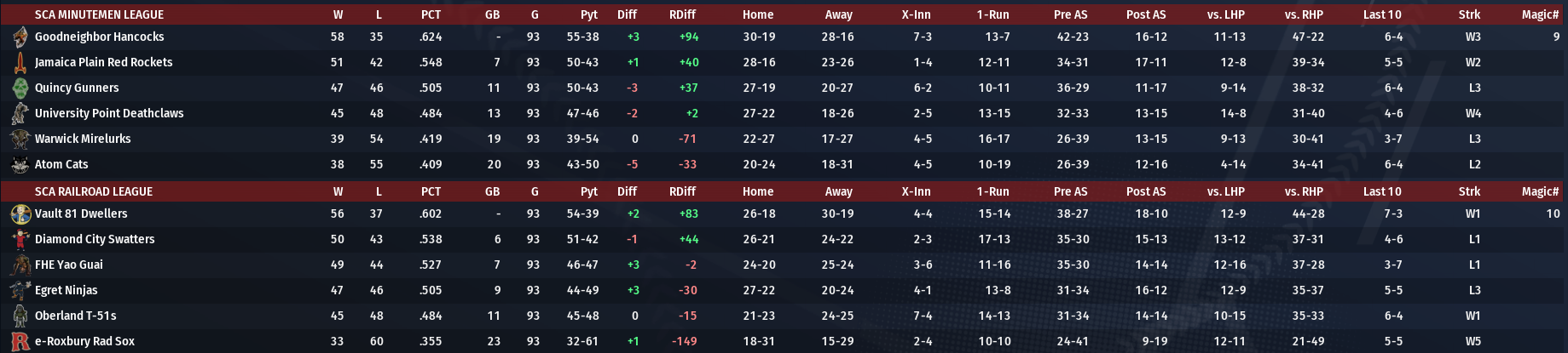 The North Charles Association has become interesting as we cruise into the last three weeks of the regular season. There are now two league ties and a tie for the first-ever wildcard spot. On the other side of the Charles, league leaders Goodneighbor (#2) and Vault 81 (#3) could see their leagues wrapped up this week if everything goes right.