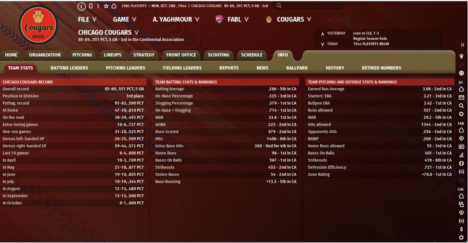 Plenty of other Cougars led categories, including Dick Walker (FABL, 141 BB; CA, 97 R), Orlin Yates (FABL, 26 SH), Hank Barnett (CA, 9 SF), Art White (t-CA, 18) and Rusty Petrick (CA, 5.2 K/9), while plenty filled in top 5s for the CA. That includes average (5th, Mead .324), homers (2nd, Moss 19; 4th, Barnett 16), RBIs (t-2nd, Barnett and Mitchell 90), OBP (2nd, Mitchell .392; 4th, Mead .377), slugging (2nd, Mead .471), OPS (2nd, Mead .848), WAR (2nd, Schneider 6.7; t-5th, Mead 5.7), runs (2nd, Mitchell 94), doubles (5th, Mead 38), triples (t-3rd, Walker 14), total bases (5th, Barnett 256), walks (4th, Barnett 73), ISO (t-4th, Mead .147), OPS+ (2nd, Mead 147; 4th, Barnett 131), WPA (3rd, Moss 2.91), wOBA (5th, Mead .380), ERA (2nd, Parker 2.19), wins (t-5th, Parker and White 16), saves (t-5th, Curtin 13), WAR (3rd, Riley 5.6), innings (3rd, White 272), complete games (4th, Riley 16), shutouts (t-2nd, White 3), strikeouts (4th, Riley 104), K/BB (4th, Riley 1.8), K/9 (3rd, Parker 4.6), BB/9 (t-4th, Lyons and Parker 1.6), WHIP (5th, Lyons 1.24), FIP (3rd, Riley 2.95), ERA+ (2nd, Parker 156), rWAR (2nd, Parker 8.0), BABIP (2nd, Parker .247), OPP AVG (2nd, Parker .222; 3rd, Petrick .241), win % (4th, Parker .615), shutdowns (3rd, Curtin 27), and quality starts (t-2nd, Parker 24). We had a lot of really good individual performers, but once things got bad, we couldn't get it back going.