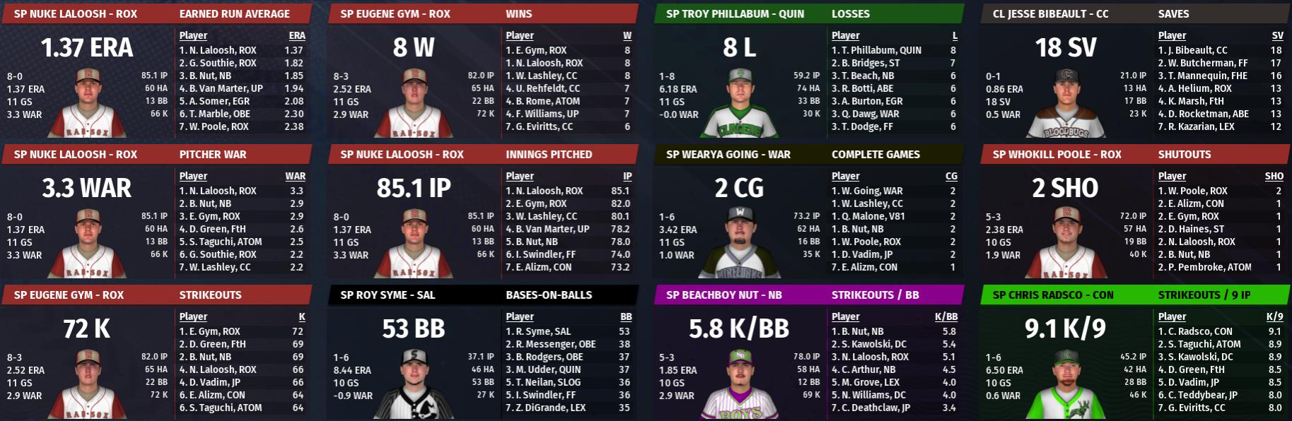 SL Pitcher - SP Gooseberry Fullwallet, Big John Salvagers (Roxbury), 4 GS, 3-1, 1.64 ERA, 33.0 IP, 33 K, 4 BB, .178 Opp BA