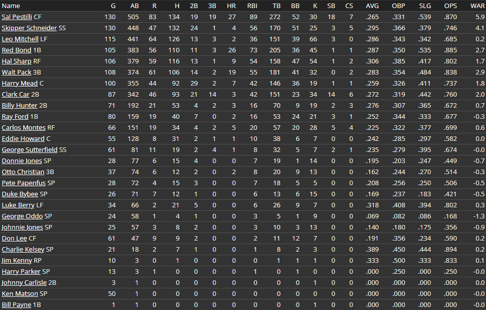 Johnnie Jones had a nice rebound start despite the loss, 8 innings with 7 hits, a run, two walks, and a strikeout. Donnie also pitched well in a loss, 8 innings with 9 hits, 3 runs, 4 walks, and 7 strikeouts. Both two start starters went .500, with Pete Papenfus 1-1 and George Oddo 0-0. Pap's control was a bit off, as he walked 10 hitters in 15 innings with 15 hits, 7 runs, and 6 strikeouts. Not quite what we are used to, and both of his outings were equally boring, but he's pulled into a tie with Bybee for the team lead in wins, securing his 16th in 28 starts. George Oddo was as unlucky as ever, and despite allowing 4 runs in each of his starts, he had a WHIP of 1.00 or better and 13 strikeouts to just 5 walks. On track for his first 200 inning season, Oddo has won just seven starts despite an impressive 3.17 ERA (124 ERA+) and 1.16 WHIP. He's struck out 110 and walked just 55, and his 2.0 K/BB trails just Rufus in the association. He leads most categories, but Oddo ranks top five in K/9 (5.6), WHIP (1.16), and opponent average (.232). He's the best fifth starter in baseball, but both Dixie Marsh and OSA still won't rate him anything more then an emergency starter. He's been effective all season long, and it's a shame he pitched during the war or he'd probably be in the Kellogg running this season.