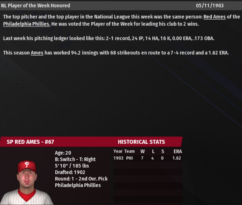 The #2 overall selection in the most recent draft, Red Ames was viewed as a pitcher who should make an immediate impact. Not only has Ames lived up to the lofty expectations thus far (7-4 record with a 1.62 ERA), he strung together an outstanding week to take home the National League Player of the Week honors. In picking up his first PofW award, Ames posted a 2-1 record with a 0.00 ERA in 24 innings of play that resulted in 0.8 WAR and 1.2 WPA.