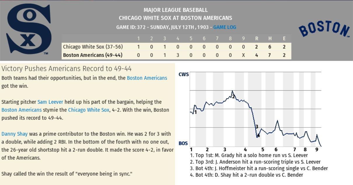 A much needed win against the last-place American League team. While the game was closer than I would have hoped for, in the end the Boston Americans (49-44) topped the Chicago White Sox (37-56) by a score of 4 to 2.