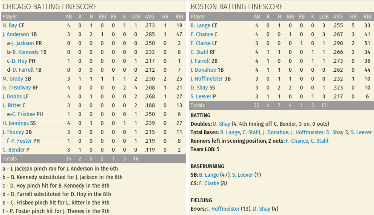 Sam Leever (13-9) got back on the winning track, limiting the opposition to 2 runs (1 earned) on 6 hits and 1 walk; Game Score 73. Charles Bender (11-14) was burdened with the loss after allowing 4 runs (3 earned) on 7 hits and 1 walk; Game Score 56.