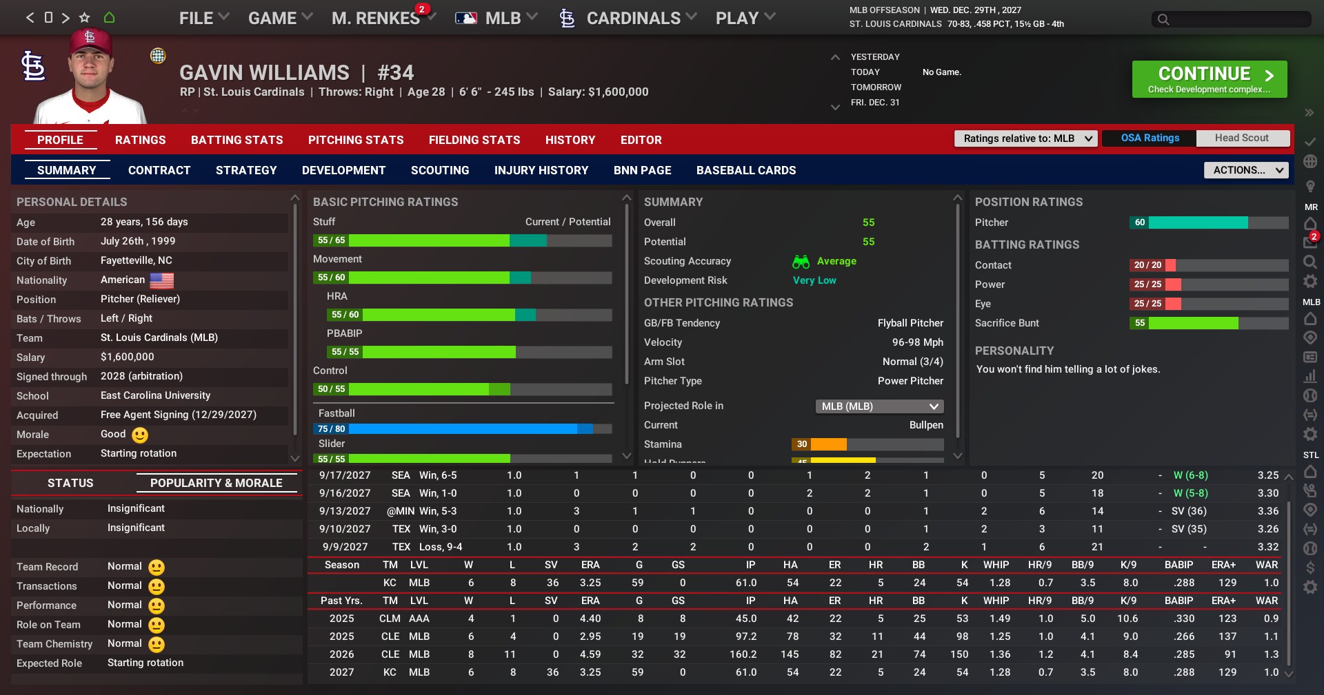 Williams broke into the majors in 2023 with Cleveland and during that time has pitched in 142 games/83 starts going 26-38 with 36 saves and a 3.90 ERA.
