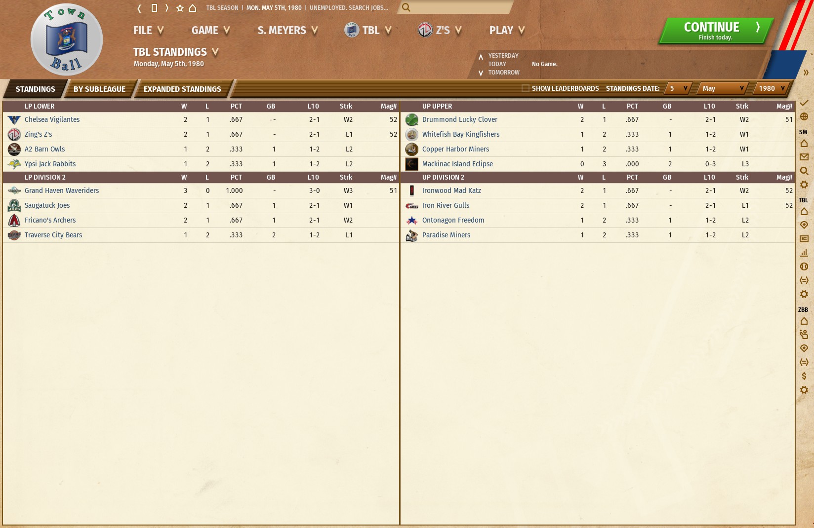 The year is 1980. The Upper Peninsula will have two divisions of 4 teams. The Lower Peninsula structure will be identical. 54 Game Season with division winners meeting in a 7 game series. The winner advances to the 'State of Michigan Town Ball Championship', another 7 game series. Yearly All Star Contest pitting the UP vs LP Three games will be played per week, Friday to Sunday. These players have 'day jobs' and play for free on the weekends. Local fans support their teams with a fervor that allows the clubs to pay for their uniforms and to maintain their fields. Some of the fields are in very unlikely locations, pastures, vacant lots, etc. But, most have lights and a small amount of seating. Local Sponsors frequently chip in to help the cause. Players will not change teams. After all, this is their community that they play for and, unless they changed neighborhoods/cities, they will begin and end with the same ball club. The player age will range from 15 to mid forties. Player Develpment rate is kicked up and Player Ageing is slowed down a tick, or two. There will be no draft. Each year, in order to replace ageing/retiring players, some young Michigan H.S. players from the feeder league will be added. Rosters are set to 20 with a reserve roster of 3. Injuries will be Very Low.