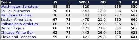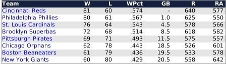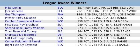 The American League race was so tight that the 140 game regular season wasn't enough to determine the winner as the Detroit Tigers and Chicago White Sox finished the season tied at 77-63, forcing a one game playoff that was won by the Tigers. The Tigers pitchers were led by Rookie of the Year winner Ed Siever, who racked up 19 wins to go with a 3.02 ERA in 271 innings. Offensively it was left fielder Doc Nance whose 83 rbis led the Tigers and kept the offense humming throughout the season The National League didn't have the intrigue of a single game playoff as the Phillies outran their Pennsylvania rival Pirates by a six game margin and a major league best 91-49 record. Again, like the Tigers, the Phillies were led by a rookie hurler as Doc White notched 24 wins to pace the Philadelphia pitching staff. All told however, the Phils notched 3 20+ game winners in White, Red Donohue (20), and Bill Duggleby (20). On the offense, right fielder Elmer Fick had a team leading 8 HR's and 65 rbi to pace the attack. World Series - Philadelphia 4 Detroit 1 Code:
