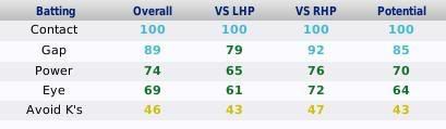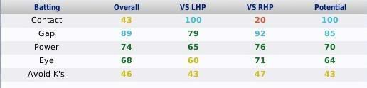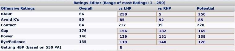 I simmed a season. On Jan 1, 2009 I looked at the batting ratings For Eye of the 54 players who had a vs R eye rating of less than 10, they had an average vs L eye rating of 218.03 For Gap of the 25 players who had a vs R gap rating of less than 10, they had an average vs L gap rating of 225.88 For Power no players had vs R power less than 10, but this is accounted for by the fact that power ratings actually go up to 350!!! What is odd is that apart from power there are no ratings of 251 to 255!!! Makes me think that possibly the roll-over is coded (or a value greater than 250 is being carried over to the next byte which is why power has the capacity for more than 250... |