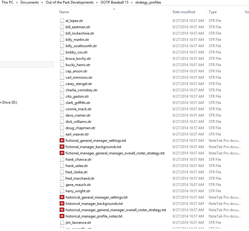I don't like coaching in this game. Frankly, I find the feature to be boring and tedious, especially recruiting personnel. But if I turn coaching off, then I am faced with a Team Strategy of down the middle settings. When I start tinkering with that, it becomes a bit mind-boggling to pick settings and apply them to four different game times and nine different score situations. Sure, I know you can copy strategy settings to all game times and score situations but that seems like dumbing it down. So, I found something better which allows me to leave coaching off but introduces some variability in Team Strategy, which I can "accept" and "blame" on somebody or something else. If I don't like how things are going, I can always change horses and without the sorting for LEGENDARY this and that coach rating, followed by "negotiations" with faceless virtual folks. What I had forgotten was that when you select "Import Strategy From File," there are a bunch of fictional and historical strategy files already in the /strategy_profiles folder. Moreover, there are text files in there which provide summaries of fictional and historical managers, not by strategy setting of course, but descriptive like "Flynn sees the value of having a pitcher who will take advantage of lefty/righty matchups. Wants his pitchers to have stamina and will go with them as far as he can." So you can "interview" these managers and choose the strategy profile of one that sounds like the style of play which you prefer. What a cool feature and one which completely meets my needs! ![]()