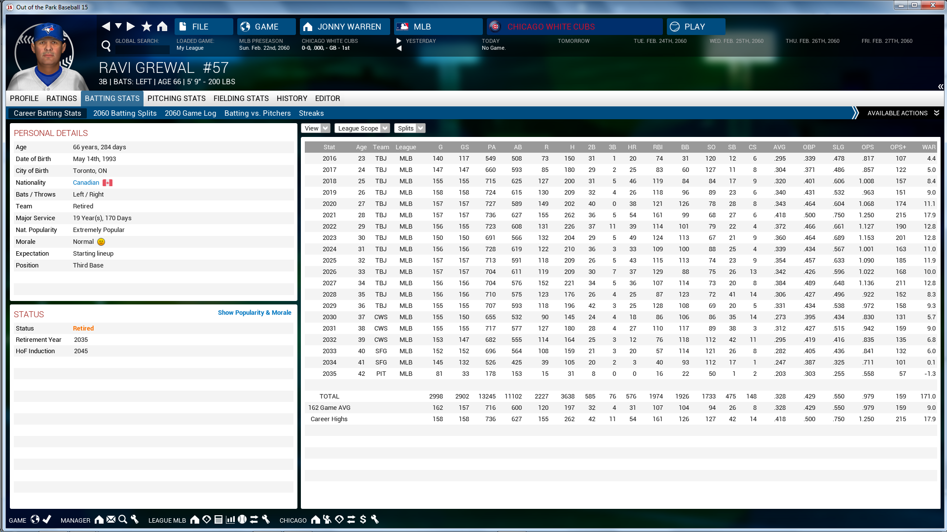 Look at his 1996 season. .407 AVG, 1.158 OPS, 37 homers, 126 RBI's.. Have to think that's up there with some of the greatest seasons I've ever seen in OOTP. I would have liked to have seen him play 20-30 more games though. His follow up season was still great but pales in comparison. There was no chance on improving on or even hitting those numbers again. |