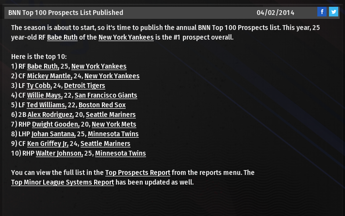 Babe Ruth, P/RF, NYY is the #1 prospect.