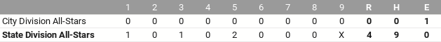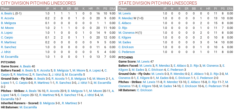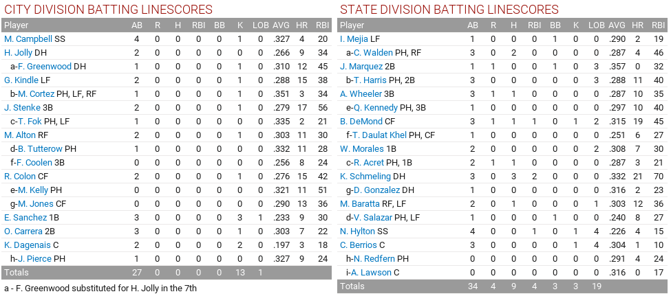 Phoenix Park – 32,000 in attendance, 67 degrees, wind blowing out to centre at 11 mph City Division ![]() Matt Campbell - 852,391 votes SS: Matt Campbell (USA - Manhattan) – 0.327 AVG, 0.843 OPS DH: Harry Jolly (AUS - Brooklyn) – 0.266 AVG, 0.750 OPS LF: Gary Kindle (USA – Staten Island) – 0.288 AVG, 0.882 OPS 3B: Justin Stenke (USA – Queens) – 0.279 AVG, 0.850 OPS RF: Mike Alton (USA – Staten Island) – 0.303 AVG, 0.929 OPS CF: Roger Colon (MX – Manhattan) – 0.276 AVG, 0.956 OPS 1B: Edward Sanchez (CR – Queens) – 0.233 AVG, 0.749 OPS 2B: Oscar Carrera (USA – Bronx) – 0.303 AVG, 0.838 OPS C: Kyler Dagenais (USA – Staten Island) – 0.197 AVG, 0.583 OPS SP: Aubrey Beals (CA – Queens) – 2.06 ERA, 1.06 WHIP, 6.8 K/9 Other players: SP Rico Acosta (Bronx) / SP Ruben Duarte (Queens) / SP Joey Idrizi (Queens) / SP Arturo Lopez (Brooklyn) / SP Ed Magaora (Staten Island) / SP Jose Martinez (Brooklyn) / SP Bret Melgoza (Bronx) / SP Mike Moore (Brooklyn) / RP Cesar Carpio (Queens) / RP Ari Lichtenegger (Staten Island) / CL Manny Escamilla (Staten Island) / CL Ricardo Martinez (Bronx) / CL Mike Yerger (Manhattan) / C Gregg Marino (Brooklyn) / 1B Mike Kelly (Manhattan) / 1B Barry Tutterow (Staten Island) / 2B Ryan Sauer (Manhattan) / SS Ferdi Coolen (Staten Island) / SS Mickey Jones (Queens) / LF Ta-heng Fok (Brooklyn) / LF Jeff Michaux (Queens) / RF Manny Cortez (Queens) / RF Fred Greenwood (Manhattan) / RF Luis Ventura (Bronx) Queens Diamonds: 11 players Staten Island Bulls: 8 players Manhattan Victory: 7 players Brooklyn Knights: 6 players Bronx Phoenix: 5 players State Division ![]() Bryan DeMond - 2,091,272 votes LF: Israel Mejia (DO – Rochester) – 0.290 AVG, 0.784 OPS 2B: Jose Marquez (USA – Rochester) – 0.357 AVG, 0.958 OPS 3B: Andrew Wheeler (USA – Buffalo) – 0.287 AVG, 0.846 OPS CF: Bryan DeMond (USA – Syracuse) – 0.315 AVG, 1.015 OPS 1B: Willy Morales (DO – Buffalo) – 0.308 AVG, 0.921 OPS DH: Keith Schmeling (USA – Rochester) – 0.332 AVG, 1.038 OPS RF: Matt Baratta (USA – Albany) – 0.303 AVG, 0.875 OPS SS: Nolan Hylton (USA – Syracuse) – 0.226 AVG, 0.601 OPS C: Chris Berrios (USA – Yonkers) – 0.304 AVG, 0.741 OPS SP: Mike Lewis (USA – Yonkers) – 3.50 ERA, 1.20 WHIP, 8.0 K/9# Other players: SP Jonathan Brown (Yonkers) / SP Mario Cisneros (Rochester) / SP Victor Garcia (Rochester) / SP Miguel Hernandez (Albany) / SP Evan Kilgore (Albany) / SP Daniel Rijo (Albany) / RP Eddie Aldaco (Rochester) / RP Mike Eades (Yonkers) / RP Bobby Miller (Rochester) / CL Chris Erickson (Rochester) / CL Matt Kaehr (Buffalo) / CL Ramiro Mendez (Albany) / CL Chris Pederson (Yonkers) / C Raymond Acret (Rochester) / C Adam Lawson (Syracuse) / 1B Patrick Warke (Yonkers) / 2B Danny Gonzalez (Syracuse) / SS Terry Harris (Albany) / LF Vicente Salazar (Yonkers) / LF Curtis Walden (Rochester) / LF Phil Williams (Albany) / CF Tahir Daulat Khel (Buffalo) / RF Nathan Redfern (Syracuse) Rochester Union: 10 Albany Dragons: 7 Yonkers Sixers: 7 Syracuse Maples: 5 Buffalo Bruisers: 4 City Division 0 – 4 State Division ![]() LT: Leonardo Totti, live from the packed Phoenix Park here in the Bronx, where the State Division have just wrapped up the inaugural NYBL All-Stars game in style, on a 4-0, no-hitter against the City Division. I’m here with Brian Guthrie, and Brian surely, this means we’re looking at a State Division side taking the All-New York at the end of the season in September? BG: Well I wouldn’t like to make a call like that only 66 games into a 144 game season, and reading into any All-Star Game like this is difficult because most of the players aren’t playing with those they know from their own teams – but it’s definitely not a good sign for the City Division is a selection of their finest, or, supposedly finest players can’t even get a hit between them. LT: Well yeah, that’s what I was thinking. Shall we talk about our highlights of the game for a moment though, cos obviously this is a celebration and we should be treating it as such. BG: Absolutely. I’d like to start off with my favourite run of the game, which came from the Buffalo youngster Andrew Wheeler in the bottom of the 5th. Reaches on an error after 2 strikes from Arturo Lopez so gets a free ride on base, and then he watches as Bryan DeMond strikes out swinging on 2-2 – expected as Lopez was pitching 98, 99 today easily. Then, this is where it gets good – Raymond Acret somehow finds a single out onto the right and Wheeler just GOES. I don’t even think the fielders had figured out what was going on and he was at second, and then he just batters round to third while Acret stays at first. Finally, he gets home from man-of-the-match Keith Schmeling but – yeah, the effort is what makes that for me. LT: Speaking of Schmeling he’s just joined us here now for a brief word – we’ll only keep you a moment cos I know you’re a busy man, but how does it feel to be the All-Star MVP in the first ever game? KS: First of all, I just want to thank everyone that voted for me to play here today – was very moving to be given this opportunity to play with all these wonderful players, so er, thank you. I’m a little surprised to be named MVP as I don’t think I played exceptionally, but it was a funny sort of game you know, thought we’d see a few dingers but it’s was pretty tight and pretty nervy really. LT: 3-from-3 and 2 RBI’s is hardly shabby Keith! KS: Yeah I know [laughs] but uh, there were some great performances out there. I saw DeMond make 4 or 5 tricky catches easily, as well as the run and the RBI; I thought Raymond [Acret] was excellent today, hit and a run with plenty of effort; Wheeler was great, he’s got a long future ahead of him; I think we’re all a little gutted for Manny Cortez on the City side as well – only got 3 innings but made some great hits well caught, and fielded superbly as well. LT: Thanks a lot Keith, we’ll let you go have 