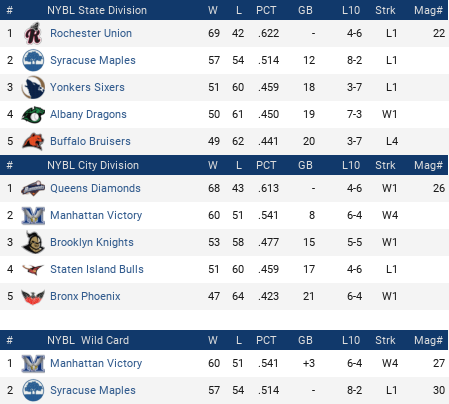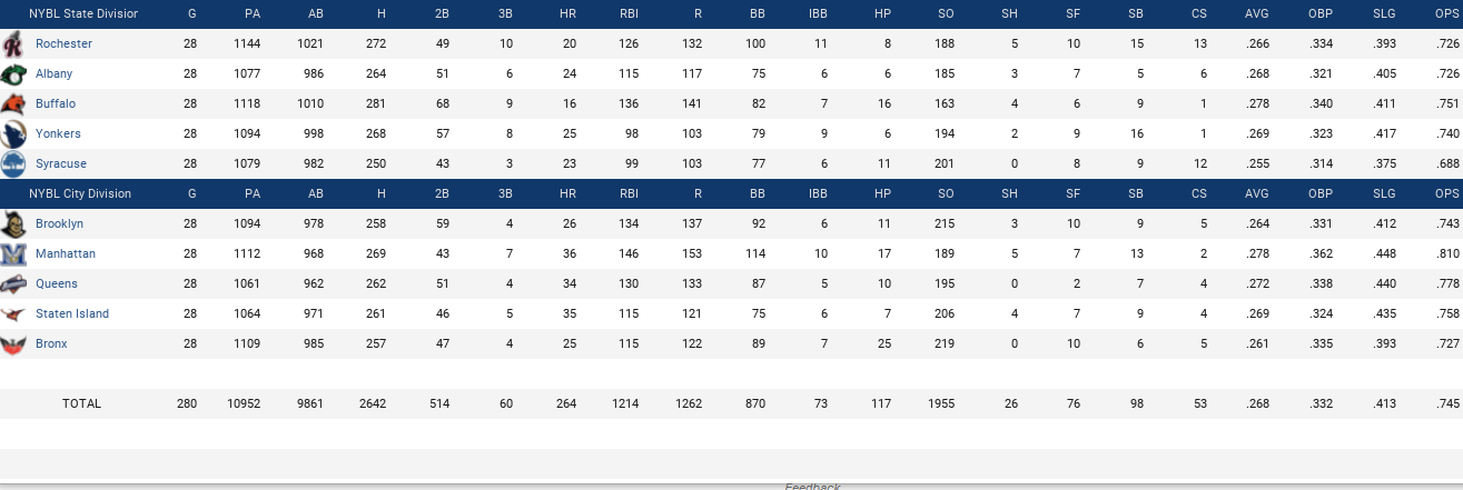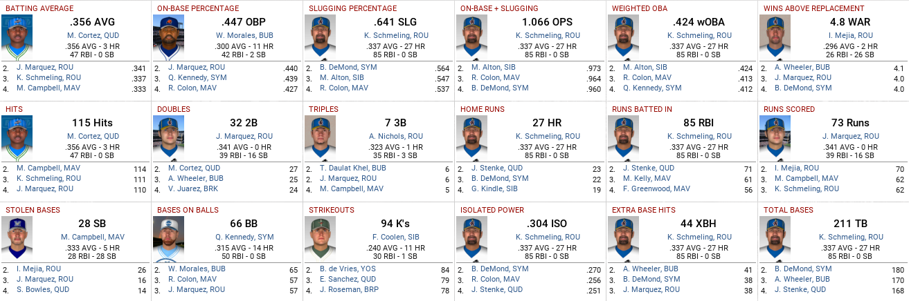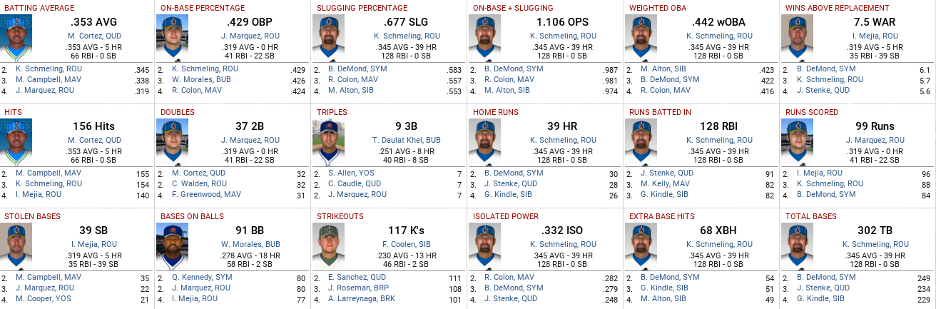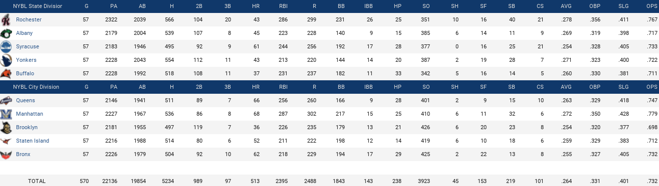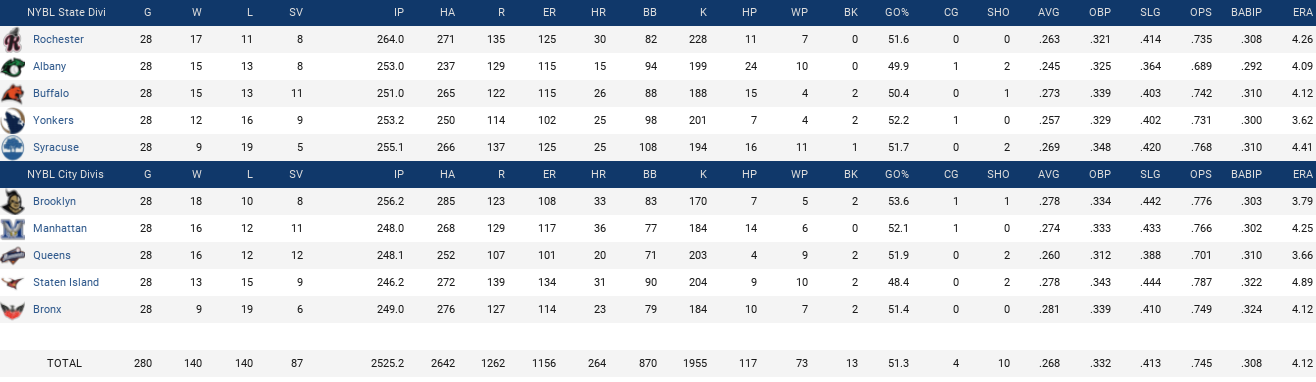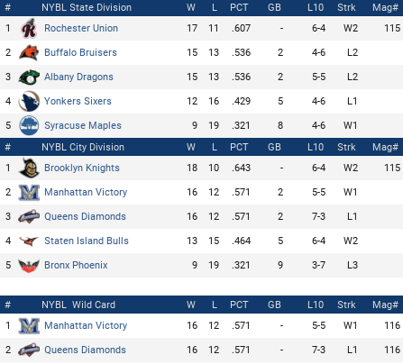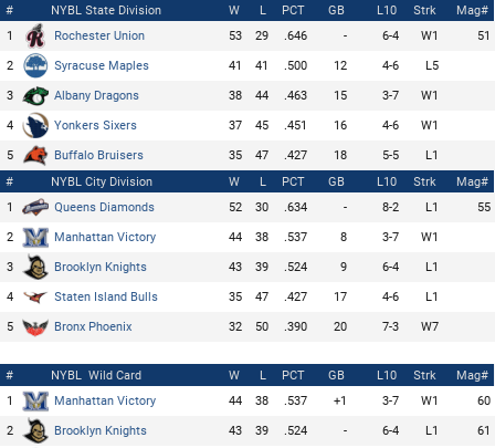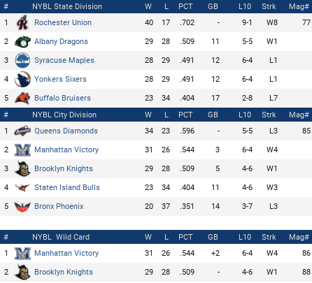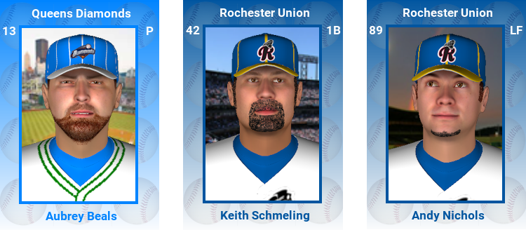 BEST RECORD - Rochester Union: 16-13 (now 69-42) Queens Diamonds: 16-13 (now 68-43) Manhattan Victory: 16-13 (now 60-51) Syracuse Maples: 16-13 (now 57-54) Staten Island Bulls: 16-13 (now 51-60) Bronx Phoenix: 15-14 (now 47-64) Buffalo Bruisers: 14-15 (now 49-62) Yonkers Sixers: 14-15 (now 51-60) Albany Dragons: 12-17 (now 50-61) WORST RECORD - Brooklyn Knights: 10-19 (now 53-58) 1st July: July opened tentatively, as all but one game today was decided by more than one run – and two required extra innings to break the deadlock. A shutout from Yonkers pitcher John McCarthy was needed after RF Kenneth Aydell’s scrappy run was the only point scored in their 1-0 win over the Brooklyn Knights; Staten Island eventually overcame Bronx catcher Albert Lopez’s 2nd-inning, 2-man home run with an 8th-inning homer from Mike Alton, and finally an 11th-inning decider from Gary Kindle to wind things up at 3-2; Manhattan’s 5-4 victory over Buffalo was only decided in the 10th after Victory shortstop Matt Campbell hobbled round following his hit-by-pitch; and Queens LF Jonathan Parker gave the only real excitement in the Diamonds’ slow 2-1 victory over Rochester, in arguably today’s highest profile game. The only exception to the ‘one run difference’ rule today was seen in Syracuse’s 9-4 victory over the Albany Dragons, which despite the Dragons having an excellent 2nd (3 runs, including an RBI double from Todd Morse and a 2-man homer from former Maples man 1B Matt Gilbert), was exemplified by Jonathan Claxton’s wonderful 3-man home run in the 6th for Syracuse and DeMond’s 2-RBI double in the 4th. Finally, Manhattan’s streak-king Matt Campbell saw his run of hitting games ended in the aforementioned 5-4 win against Buffalo, as he was unable to find the ball in 3 at-bats. Victory manager Richard Perry was surprisingly upbeat, however, stating that “at least now he doesn’t have a trophy over his head, and he can just focus on playing good baseball.” 2nd July: Two pitcher related stories today: one bad, one good. The bad first, as Bronx started Pedro Alvarado herniated a disc in his back today during their 2-9 defeat to the Staten Island Bulls. Known primarily for his fastball, the 25-year-old looks set to miss at least 7 opportunities in the rotation, as physios have put him out for 5-6 weeks while his back recovers. “It’s been a frustrating year for him, partially as he’s not actually played badly,” said manager Josh Simpson. “He’s one of our top players and we’ll be looking forward to his return.” Alvarado currently sits on a 3.51 ERA with 83 strikeouts. In brighter news, Moses Adams had a fantastic game for the Syracuse Maples, as he helped his side to a 4-0 victory over the struggling Albany Dragons – including only giving up a single hit, fanning 5, and walking 0. “I’ve been replaying that hit in my head a bit,” said the 26-year-old slider/changeup specialist, “but the boss has told me to not dwell on it. It was a great game.” 3rd July: Manhattan Victory were soundly beaten at Rochester’s Irondequoit Grounds today, as the first game of their 3-game series finished 17-6 in the Union’s favour. “The rain break in the 3rd really hurt us,” said Victory manager Richard Perry afterwards. “Phil [Gesch, LF] managed to get us on equal footing immediately afterwards, but we absolutely fell to bits in the bottom 4th. I don’t think I’ve ever seen so many singles in an inning.” Rochester scored 7 in the 4th, amazingly all from singles and BB calls, followed by a 2-man homer from Schmeling in the 5th and 2-man RBIs from both Schmeling and Curtis Walden in the 7th. In other news, despite Bill Williams pulling out a masterful 3-man homer in the 9th to keep Brooklyn in it, the Staten Island Bulls claimed a 12-inning, 7-6 victory over the Knights. “I did all I could today,” said the 31-year-old LF from the borough, who managed 4 RBIs in total, “but sometimes the chips just fall all wrong.” The deciding factor was solo home run from Bulls CF Chris Meche, only his 4th of the year. Finally, Queens heavy-hitter Justin Stenke earned a well-deserved Player of the Week award for this week, for his part in the Diamonds’ 6-1 week comprising of a 0.423 batting average, 2 home runs and 6 RBIs. Speaking to assorted press, the $5m-a-year third-baseman said “well this was a great thing to wake up to! It’s been a good week, and I’m so proud of our team keeping Rochester honest!” ![]() 4th July: Staten Island are rapidly becoming Brooklyn’s least favourite team, after another extra-innings defeat for the Knights against the Bulls ending 9-8 in the 10th. A great 3rd for the Knights, seeing a 3-man homer for Harry Jolly, and RBI doubles for both Victor Juarez and AAA-man Cortez Martinez, gave the side a 5-0 lead early on, but gritty gap-hitting from C Kyler Dagenais, LF Gary Kindle and CF Chris Meche meant that the game tied at 6-6 by the 7th. Brooklyn hit back in the 8th with another 2 runs, only for Kindle to knock a 2-man homer out in the bottom 9th, followed by a match-winning solo home run from Dagenais in the 10th. “We pulled it together superbly today” said the 30-year-old catcher, voted MVP. Dagenais is currently sitting on a 0.226 with 4 home runs this season. Meanwhile, despite a spirited display from Buffalo’s LF Juan Elizondo and RF Synan Sheehan to claim back 2 runs in the 9th, the 3 scored earlier in the innings by C Chris Berrios’ home run and decent contact hitting saw the Yonkers Sixers claim a thrilling 6-5 victory over the Buffalo Bruisers. 5th July: Staten Island did it again! Despite home runs from 3B Harry Jolly and LF Bill Williams, it was a plucky bottom-9th run from the Bulls’ Gary Kindle that handed the island side their 4-3 victory – and importantly, a series shutout – against Brooklyn’s Knights. “I’m glad to be leaving Staten Island,” said Brooklyn manager Jon Aguirre, now 6 games without a win. 