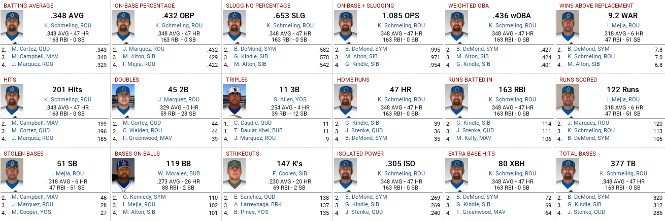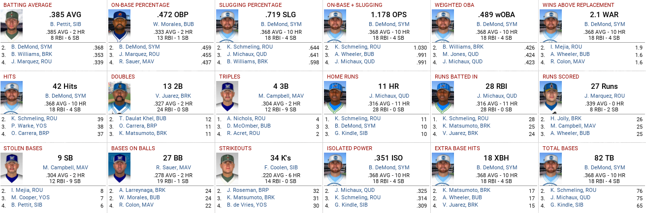 BEST RECORD: Queens Diamonds, 18-7 (now 52-30) Brooklyn Knights, 14-11 (now 43-39) Rochester Union, 13-12 (now 53-29) Syracuse Maple, 13-12 (now 41-41) Manhattan Victory, 13-12 (now 44-38) Bronx Phoenix, 12-13 (now 32-50) Buffalo Bruisers, 12-13 (now 35-47) Staten Island Bulls, 12-13 (now 35-47) Yonkers Sixers, 9-16 (now 37-45) WORST RECORD: Albany Dragons, 9-16 (now 38-44) 1st June: Two games were won in the 9th innings today, as Staten Island came back from 5-2 down with an excellent 4-run 9th to claim victory over the Brooklyn Knights. Much of the blame has been laid at the feet of closer Juan Sandoval, who pitched 23 balls including 4 hits (later 4 runs) to manage only two outs – he was eventually replaced himself with reliever Nick Clarke, but the damage was already done. Man-of-the-match and Staten Island captain Gary Kindle (who claimed 3 runs to the good today), offered some surprise sympathy to the opposition pitcher: “we’ve all had days where you just want the Earth to swallow you up, but Sandoval’s a great pitcher you know, and he just needs to dust himself off and get back to it.” The other game in question was a thrilling matchup between eventual winners Rochester Union, and Manhattan Victory. Rochester were 4-0 up by the upper 5th, capped by a solo homerun from Robert Navarrete, but Mike Kelly’s immediate response – a 4-man home run – seemed to give Manhattan the knife-edge. A double from AAA Herbert Wilkins helped them to number 5 and a 2-man homer from CF Roger Colon looked set to ruin Union’s day, but 2 runs in the 8th and a 2-man RBI double from Allen Krausz without response gave Rochester a stunning 8-7 victory. Asked afterwards, MVP Robert Navarrete said “it was nice to win, but we sure were sweating by the end!” 3rd June: On a 0.188 average, Buffalo catcher Zach Coblenz isn’t usually associated with the attacking game, but a 3-man home run, a second run and a third RBI made all the difference in Buffalo’s 9-5 victory away at McLean Avenue, Yonkers today. “I couldn’t believe it,” said the 26-year-old born in Brooklyn. “I think I can count the amount of days like this on one hand, at least since I left school!” Also today, Bronx Phoenix physios confirmed the injury sustained to RF Luis Ventura in their 3-2 defeat against Staten Island on the 31st May was serious… an ACL tear level of serious. The 33-year-old Dominican, currently running a 0.277 with 9 HRs, 23 RBIs and 19 runs, looks set to be out for 9 months with the tear; “looks like I’m done for the season,” he later said, “but I have a responsibility to behave myself now, to be fit for next year.” 5th June: Robert Navarrete, perhaps after his performance against Manhattan on the 1st, is voted the Player of the Week with a 0.462 batting average. The 35-year-old Rochester favourite hit 2 home runs and 5 RBIs over the week, to complete his current 8 HRs and 33 runs batted-in so far this year. ![]() 7th June: Keith Schmeling became the first man in the NYBL to hit 20 home runs this season (or indeed ever), claiming MVP with a 3-man home run, a double, and batting in 5 today in Rochester’s 10-4 home victory against the Yonkers Sixers. “I couldn’t believe it,” said Yonkers’ pitcher Roger Applen, who saw 6 runs go against him in the 2nd. “When you come up against a player like Schmeling it’s always going to be a challenge, but he seemed to be on another level today.” Schmeling sits at a 0.339 with 67 RBIs at this stage. 8th June: The Buffalo Bruisers got well-and-truly taken to the cleaners today, as they succumbed to a savage 18-2 home defeat against the Syracuse Maples today. With 3-run games from LF Manny Huerta, CF Bryan DeMond, 3B Quincy Kennedy and C Adam Lawson, there was still only one man truly in with the shot at MVP – DH Victor Lopez, who despite only managing 1 run (from his 3-man home run in the 4th), hit 4 and smashed the NYBL record for single-game RBIs at 8. “He was on fire today,” said Syracuse manager Ron Zimmermann after the game. “Every time he plays baseball, there’s nothing but maximum effort being put in, and that’s why everyone loves him.” ‘The Beast’, as he is known by fans, is currently looking at a 0.261 with 39 RBIs. 9th June: A ruthless 7-run 2nd innings from the Queens Diamonds basically ended proceedings as soon as they began, as they walked to a 13-2 victory at the Bronx’s home turf today. An excellent contact hitting display from Colt Caudle saw him pick up 3 runs, and home run no. 17 for Justin Stenke went put 3 points up in the 2nd, but it was Mike Jones, who hit 2 over the boundary that claimed MVP. 10th June: He may have given up 7 hits in the game, but Yonkers starter Jonathan Brown was still able to keep a shutout at the end of their game against Manhattan Victory, which saw the Sixers get 6 to the good. Aided by excellent performances from the likes of 3B Bobby Pines (who also managed 3 RBIs, including a 2-man HR, on top of a great defensive day), Brown was full of praise for his team afterwards, saying those fabled words “I couldn’t have done it without them.” Brown has a 6-3 record from 14 starts so far this year, and has a decent starter’s ERA of 2.74. 12th June: The All-Star Game was played today, with the State Division beating the City Division 4-0 (see above). It may not have been one of the more spectacular weekly decisions, but Player of the Week was given to 33-year-old Queens RF Manny Cortez today, after managing a 0.577 record (15 from 26) with 4 RBIs. Cortez, who was also selected for the All-Star Game today, said to reporters “I’m having the second best week of my life right now – great team, All-Star selection and now this. If I wasn’t already married I’d say this was the best thing to happen to me!” ![]() 14th June: Manhattan fan-favourite CF Roger Colon, 27, was confirmed out for 4 weeks today with a sprained ankle injury after a botched slide to base in their 8-3
