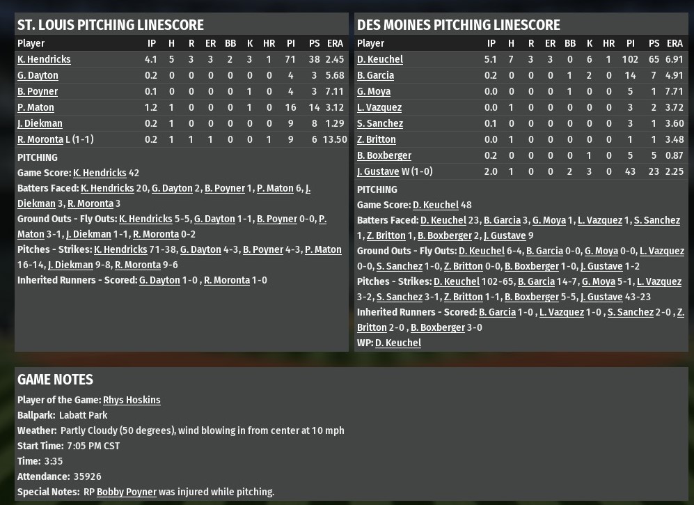 Pavin Smith hit a solo home run off St. Louis relief pitcher Reyes Moronta with one out in the bottom of the ninth inning to give Des Moines a 4-3 win at LaBatt Stadium. A Rhys Hoskins two-run home run off Harvesters starting pitcher Dallas Keuchel in the top of the sixth had tied it at 3. Keuchel pitched 5.1 innings, giving up three runs on seven hits. He was followed to the mound by seven relief pitchers. Jandel Gustave handled the final two innings and earned his second win of the season. |