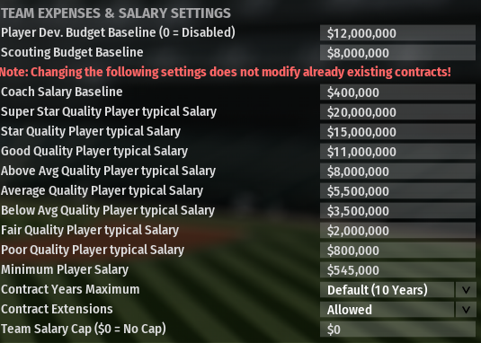 Regular settings for the 2018 financial model. Financial & Free Agency Settings Regular settings for the 2018 financial model. Team Revenue Settings I changed the national media contract to the same for every team. I hope to have more balanced finances around the league than is currently the case in real life. Team Expenses & Salary Settings Regular settings for the 2018 financial model. I did not want to change the finances too much because it seems like you can really mess things up quickly and have an entire league in debt. It will be strange when players from the early 20th century are making millions of dollars but that's not a big deal to me. I also have an Independent League and have the finances just slightly below the MLB in order to compete for lower potential players. |