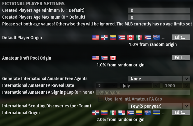 Most of the settings are the same as the NCAA league. Feeder League Settings Players come in at age 14 and all players are created at that age. Most of the high potential high schoolers get drafted into the MLB right away and very few end up in college. I couldn't find a way around this without creating way too many leagues. Playoffs Since the leagues are so small, only the top two teams play each other in the State Championship series. Fictional Player Settings Players are created at 14 and 15% come from random countries. Modifiers I left these as standard. |