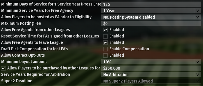 Regular settings for the 2018 MLB financial model. Financial & Free Agency Settings I want players to leave the ATL as easily as possible if they want to or if an MLB team is willing to take them. They can purchase them or pick them up as free agents. Team Revenue Settings Same media contract for every team and much higher numbers than in real life. Team Expenses & Salary Settings Contracts can only be one year so the players are always free agents available to MLB teams. I set the financials higher than typical Indy league numbers but not quite matching up with the MLB. I want this league to compete for the 30-50 out of 80 overall rating players so they don't get stuck in the free agent pool every year and have a chance to play. These finances allow them to do that but they still don't have enough money to sign any stars. Mostly players who have had injuries or who are at the end of their career find themselves in the league. |