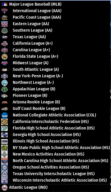 As mentioned throughout the settings portion, there is one major league (MLB, 30 teams) and one independent league (ATL, 8 teams). There is a full set of minor leagues, matching up with present-day minors (AAA, AA, A+, A, A-, R).