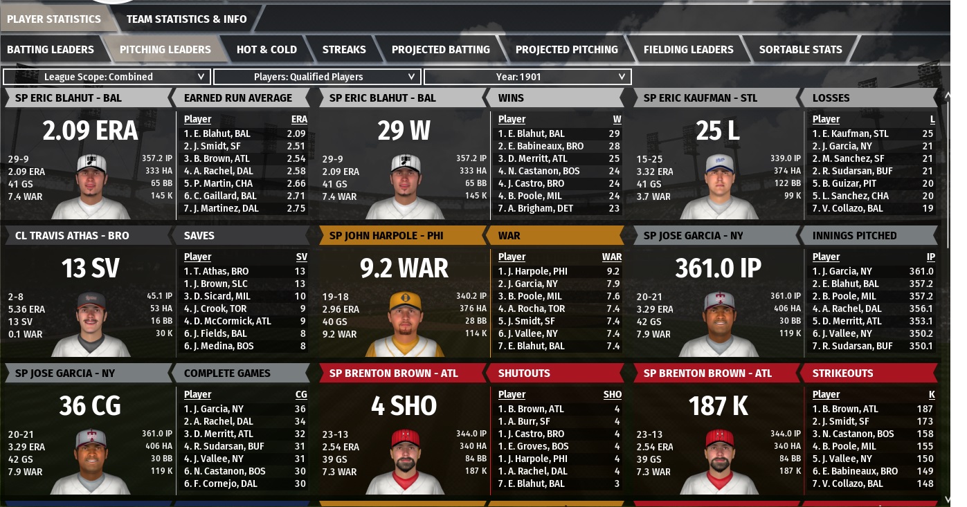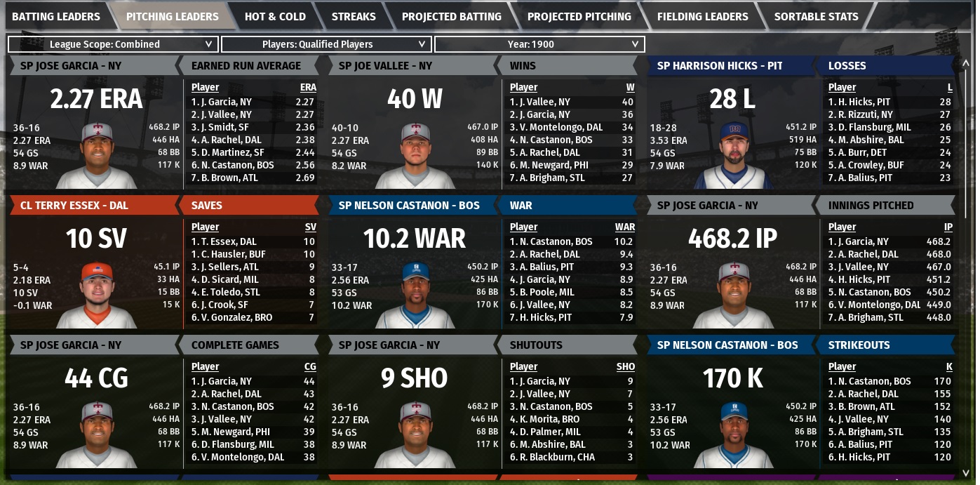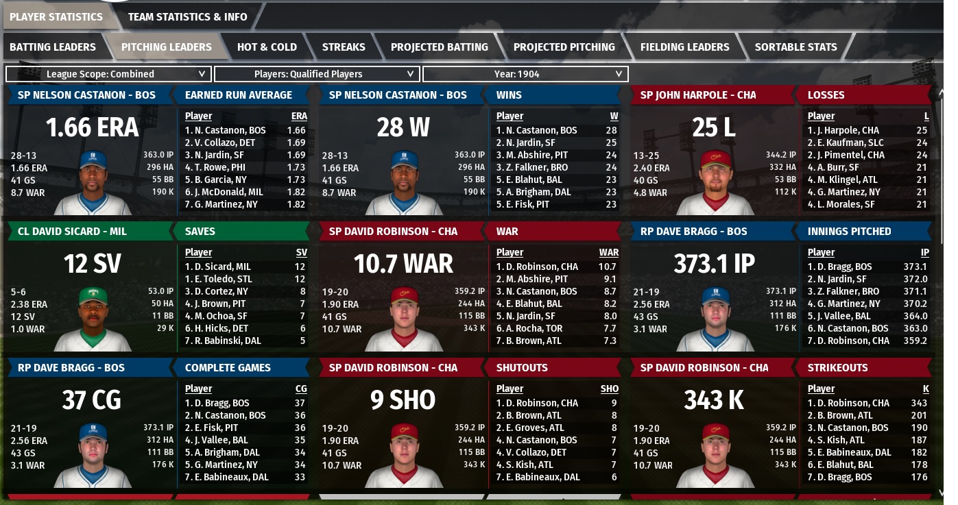 15+ strikeouts 04/13/1904 David Robinson 15 K, 2 BB and 11.0 IP versus Toronto while playing for Charlotte 08/21/1904 David Robinson 15 K, 3 BB and 13.0 IP versus Atlanta while playing for Charlotte No Hitters 05/09/1904 Matt Dobbins 4 K, 1 BB and 9 IP versus Baltimore while playing for Philadelphia Perfect Game 08/12/1904 Ryan Lovell 4 K, 0 BB and 9 IP versus Philadelphia while playing for St. Louis (PERFECT GAME) Triple Crown 1903 Eric Blahut 26-11, 2.28 ERA, 355.1 IP, 47 BB and 179 K 1904 Nelson Castanon 28-13, 1.66 ERA, 363.0 IP, 55 BB and 190 K Note: I missed Eric Blahut triple crown in 1903, so I am posting it here. Might be time for bed. |