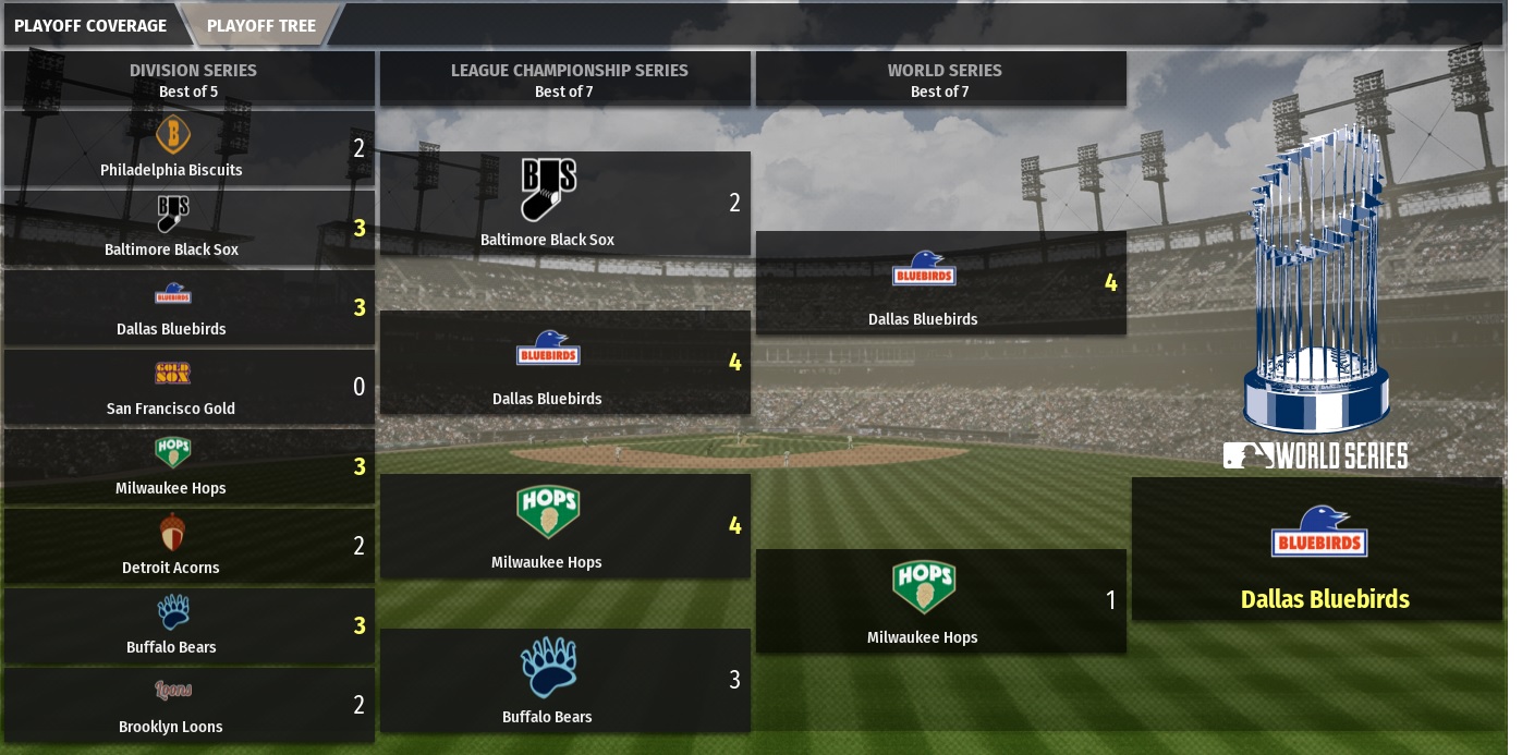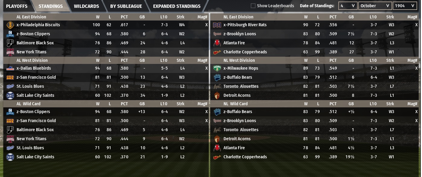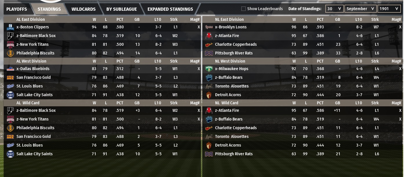January 1, 1900 The National Baseball League (NBL) is formed consisting of sixteen (16) teams, 8 in the American league, and 8 in the National league. The American League consists of East - Also known as the Coastal League New York Titans Boston Clippers Baltimore Black Sox Philadelphia Biscuits West - Also known as the Railroad Division Salt Lake City Saints St. Louis Blues Dallas Bluebirds San Fran Gold (sox) The National League consists of East Atlanta Fire Charlotte Copperheads Brooklyn Loons Pittsburgh River Rats West - AKA great Lakes division Detroit Acorns Buffalo Bears Toronto Alouettes Milwaukee Hops |