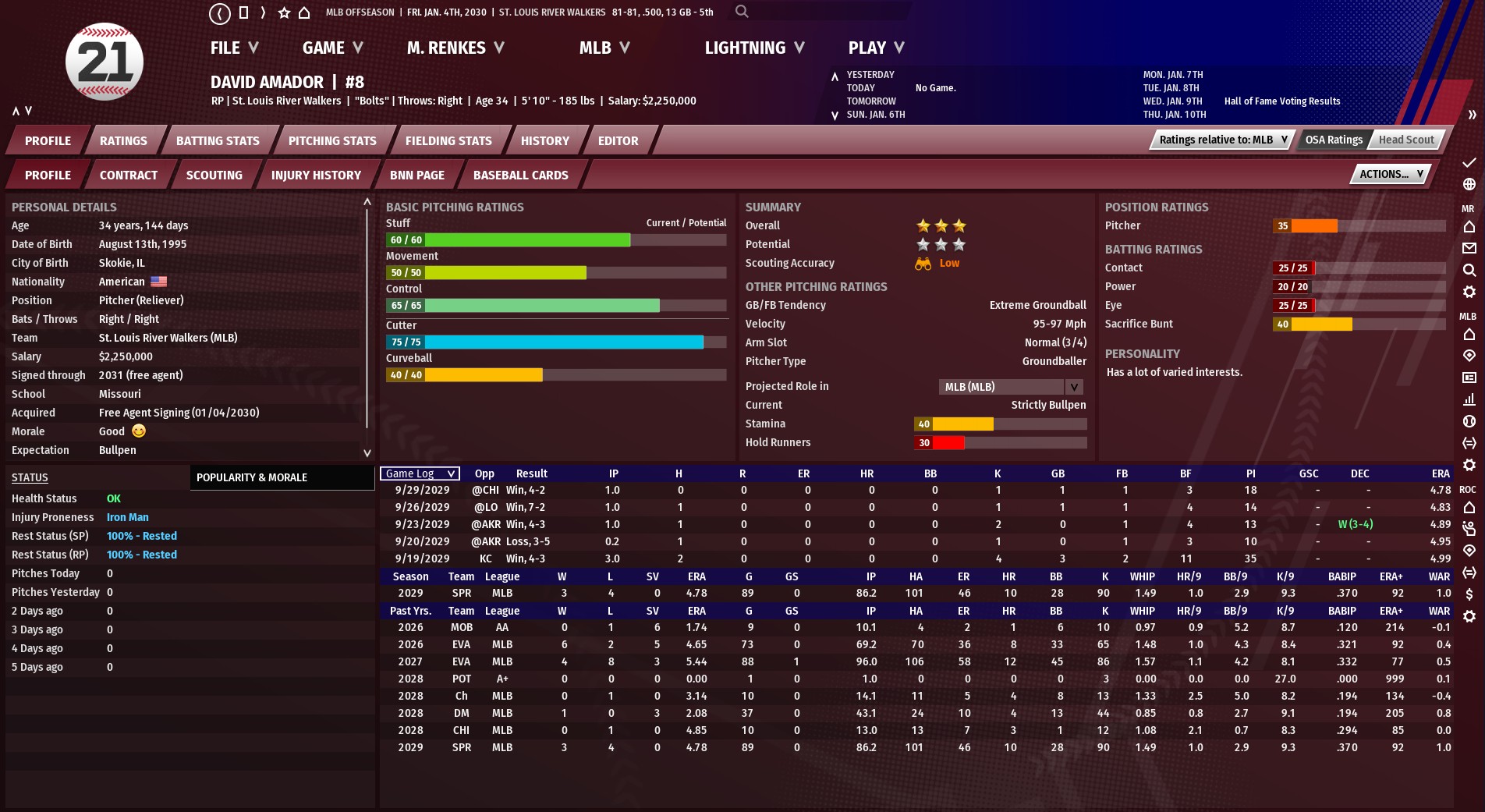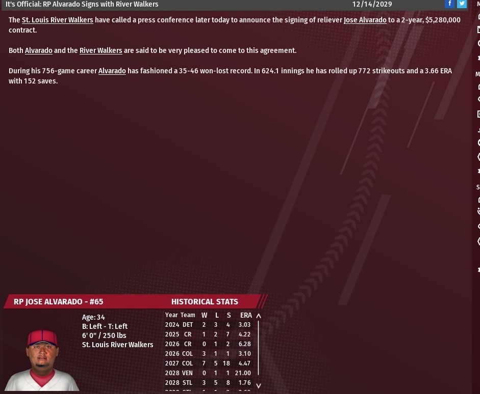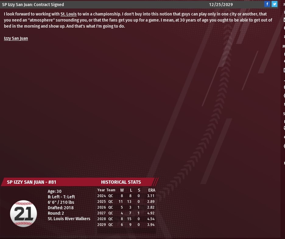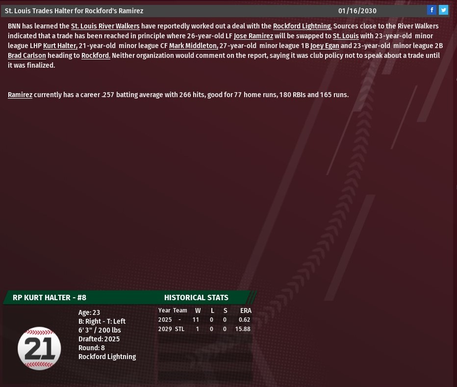 Coming off an appearance in the 2028 World Series, where they lost to Fort Worth, and three playoff trips in the previous four seasons, the Walkers stumbled to an 81-81 record and a fifth-place finish in the National League South Division. The record marked the first time the franchise had not finished above .500, and only the second time it did not place in the top four in the division since the league’s establishment in 2018. Although they sat above .500 for most of the season, the Walkers never seem to get on track and a five-game losing streak to wrap up the campaign dropped them to that 81-81 finish. Although the loss of the No. 2 starter Brendan McKay to a season-ending rotator cuff injury hurt the Walkers, as he was never really replaced, they’re pitching staff still ranked among the best in the league and their bullpen may have been the best. It was the offense which really let them down. St. Louis, which went through two hitting coaches, ranked near the bottom in nearly every statistical category in the National League with nearly every player seeing significant drops in their key numbers. Francisco Cordova served as the Walkers hitting coach, after Bryan Engelhaupt was fired 45 games into the season. The team batted .234 under Engelhaupt tutelage but weren’t any better for Cordova checking in at .233 over the final 117 games. Cordova has been re-assigned into the St. Louis farm system where he will be the hitting coach for High-A Palm Beach. The hitting coach duties now belong to Wendell MaGee, who has put together a strong resume in the Frontier League. However, the Walkers hitting woes continued during spring training of 2030, where they scored three runs or less in 21 of 30 games. (St. Louis finished 10-20 as a team). So the leash on MaGee may be short if the team fails to hit early in the season. St. Louis did make a couple of key additions in the offseason, bringing in power-hitting left fielder Jose Ramirez from Rockford, where he put together a top-10 finish in the MVP voting. On the pitching staff, left-hander Izzy San Juan was a free agent signing from Quad City where he went 6-9 with a 3.94 ERA last season. No longer here LHP – Brendan McKay, 34, 1-0, 0.90 ERA, 2 GS, signed as free agent by Springfield Penciled to be the River Walkers No. 2 starter, McKay suffered a torn rotator cuff in his second start of the season and never returned. Although, Trey Benton pitched well after being acquired in a July trade, St. Louis never really found a solid top four starter to replace McKay. His injury history made him too much of a risk to re-sign. LHP – Jason Froehlich, 26, 3-4, 4.56 ERA, 13 GS, traded to Springfield The still young Froehlich did some nice things as a starter over three seasons for St. Louis, going 19-14 with a 4.41 ERA over 62 starts. But three stints on the injured list in 2029 loomed as a red flag, and with no options available to send him to the minors when he failed to make the team after a rough spring training, the Walkers needed to see what they could get for him. (It was a couple of middling minor-league prospects). He’s expected to be the No. 3 starter for the Railers. OF – Carlos Vidal, 34, 123 G, .259 BA, 12 HRs, 37 RBIs – Unsigned free agent The left-handed hitting Vidal had a nice five-year run with the River Walkers, he batted .257 with 82 HRs and 232 RBIs over 609 games, including some big hits in the run to a World Series championship in 2025. But his numbers have started to slack as has his defense. He’s also been slapped with a fragile injury label. IF – Vidal Brujan, 32, 89 G, .210 BA, 2 HRs, 17 RBIs – Unsigned free agent. A vital utility player for St. Louis since 2026, Brujan just didn’t bring much to the table for the Walkers in 2029. He’s a good defender at second and third, but when he does not hit, he becomes easily replaceable. C – Keegan Fish, 30, 34 G, .214 BA, 2 HRs, 8 RBIs, unsigned free agent The switch-hitting catcher had a decent three-season run as the backup to Jared Thomas, but his offensive numbers have become so deficient a change need to be made. He also is lacking in the leadership categories also sought for in a backup catcher. LHP – Nick Lodolo, 32, 2-3, 1 Sv., 2.84 ERA, 47 G, signed with Des Moines Lodolo simply got caught up in a numbers game of too many left-handed relievers for just four spots. He didn’t pitch poorly, in fact 2029 may have been his best in the parts of six seasons he spent in St. Louis. LHP – Kurt Halter, 24, 1-0, 15.88 ERA, 9 G, traded to Rockford Probably the biggest piece heading to Rockford in the trade for Jose Ramirez. Halter didn’t show much in the time he spent in the majors, but he shined as the closer at AAA Memphis where he put up 16 saves and a 2.05 ERA in 49 games. The youngest has great stuff, but is very susceptible to the long ball. Right now, Halter is expected to be part of the Lightning’s starting rotation. New faces OF – Jose Ramirez, 26, B-L, T-L, .292 BA, 37 HRs, 79 RBIs, 125 G, -- Trade with Rockford The 26-year-old Ramirez appeared to have a breakout season for the Lightning, where he posted a top-10 finish in the National League MVP voting. He’s expected to play left field and bat third or fourth for St. Louis. Also brings in some leadership qualities. 2B/OF – Peter Ahn, 31, B-L, T-R, .289 BA, 15 HRs, 58 RBIs, 123 G, -- w. Peoria (Free-agent signing) Second base proved to be black hole for the Walkers in 2029. Duke Kinamon was acquired in the offseason to be the starter, but was so bad, along with being a clubhouse distraction, that he was traded to Ann Arbor at the end of June. The job was then handed to Thairo Estrada, who had performed so well as a utility player the previous season, and he was well struggled to make an impact. So the Walkers decided to take a gamble on Ahn. He’s primarily been an outfielder much of his career, but also is rated as a positive defender at second base. He’s also been decent at getting on base.
