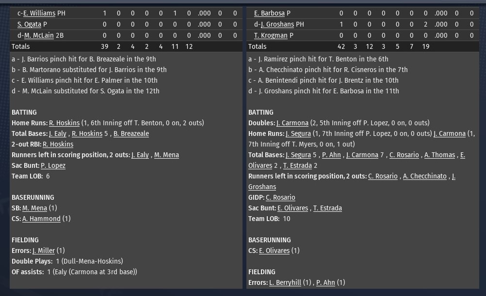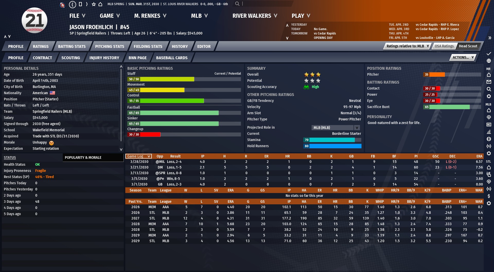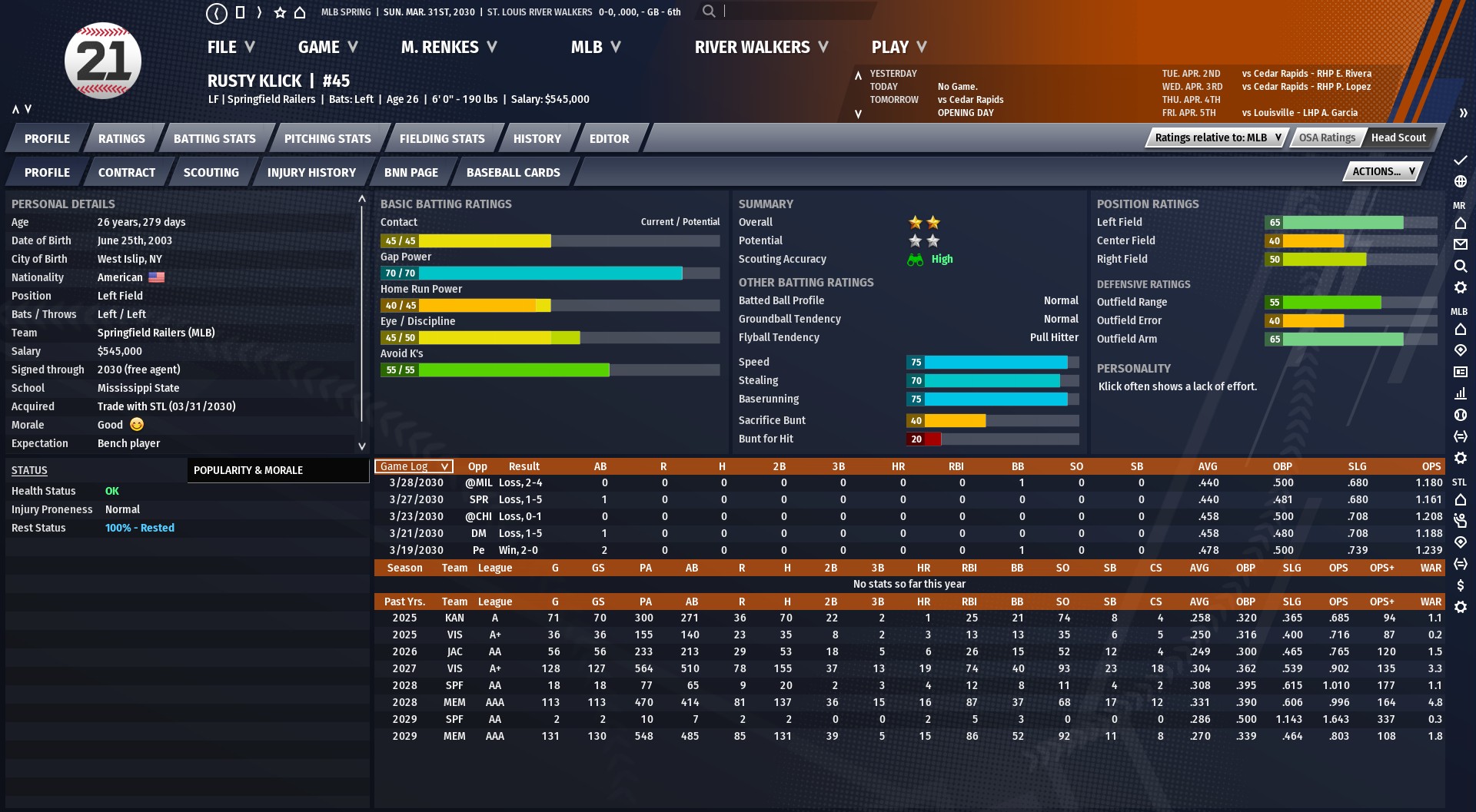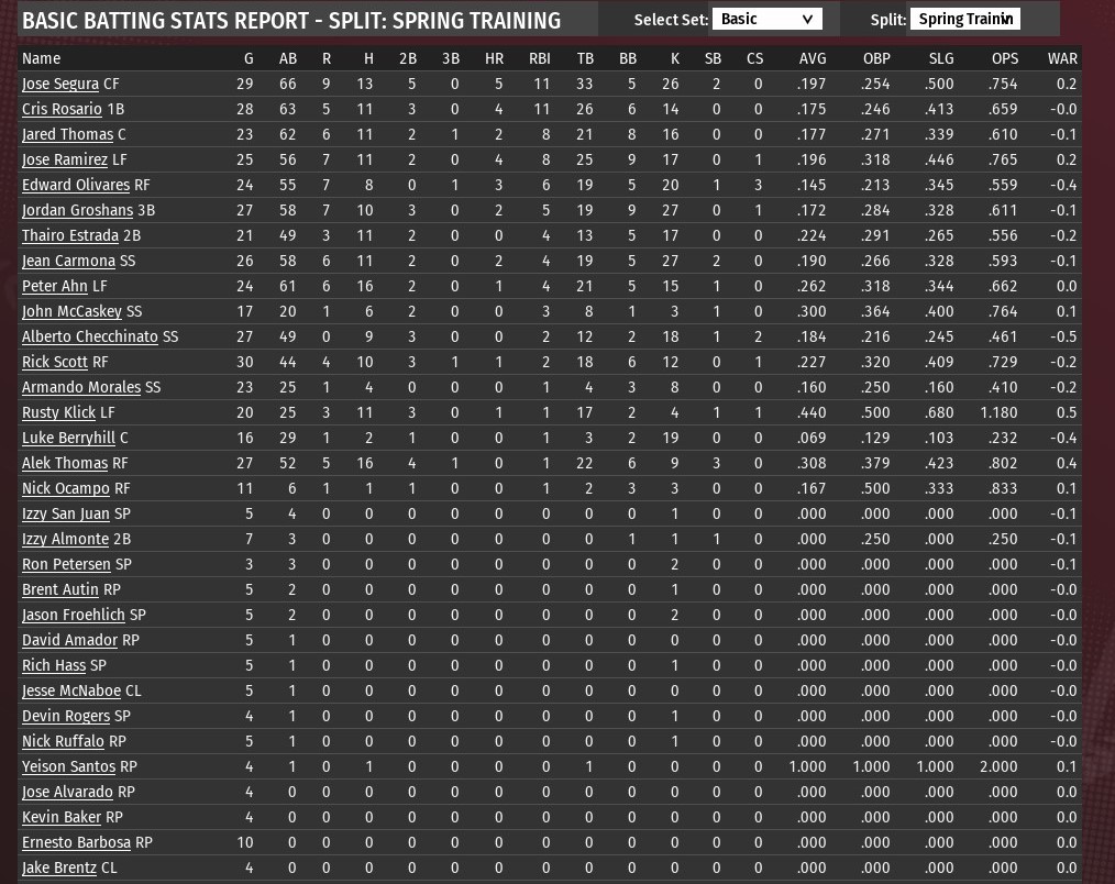 Coming off an appearance in the 2028 World Series, where they lost to Fort Worth, and three playoff trips in the previous four seasons, the Walkers stumbled to an 81-81 record and a fifth-place finish in the National League South Division. The record marked the first time the franchise had not finished above .500, and only the second time it did not place in the top four in the division since the league’s establishment in 2018. Although they sat above .500 for most of the season, the Walkers never seem to get on track and a five-game losing streak to wrap up the campaign dropped them to that 81-81 finish. Although the loss of the No. 2 starter Brendan McKay to a season-ending rotator cuff injury hurt the Walkers, as he was never really replaced, they’re pitching staff still ranked among the best in the league and their bullpen may have been the best. It was the offense which really let them down. St. Louis, which went through two hitting coaches, ranked near the bottom in nearly every statistical category in the National League with nearly every player seeing significant drops in their key numbers. Francisco Cordova served as the Walkers hitting coach, after Bryan Engelhaupt was fired 45 games into the season. The team batted .234 under Engelhaupt tutelage but weren’t any better for Cordova checking in at .233 over the final 117 games. Cordova has been re-assigned into the St. Louis farm system where he will be the hitting coach for High-A Palm Beach. The hitting coach duties now belong to Wendell MaGee, who has put together a strong resume in the Frontier League. However, the Walkers hitting woes continued during spring training of 2030, where they scored three runs or less in 21 of 30 games. (St. Louis finished 10-20 as a team). So the leash on MaGee may be short if the team fails to hit early in the season. St. Louis did make a couple of key additions in the offseason, bringing in power-hitting left fielder Jose Ramirez from Rockford, where he put together a top-10 finish in the MVP voting. On the pitching staff, left-hander Izzy San Juan was a free agent signing from Quad City where he went 6-9 with a 3.94 ERA last season. No longer here LHP – Brendan McKay, 34, 1-0, 0.90 ERA, 2 GS, signed as free agent by Springfield Penciled to be the River Walkers No. 2 starter, McKay suffered a torn rotator cuff in his second start of the season and never returned. Although, Trey Benton pitched well after being acquired in a July trade, St. Louis never really found a solid top four starter to replace McKay. His injury history made him too much of a risk to re-sign. LHP – Jason Froehlich, 26, 3-4, 4.56 ERA, 13 GS, traded to Springfield The still young Froehlich did some nice things as a starter over three seasons for St. Louis, going 19-14 with a 4.41 ERA over 62 starts. But three stints on the injured list in 2029 loomed as a red flag, and with no options available to send him to the minors when he failed to make the team after a rough spring training, the Walkers needed to see what they could get for him. (It was a couple of middling minor-league prospects). He’s expected to be the No. 3 starter for the Railers. OF – Carlos Vidal, 34, 123 G, .259 BA, 12 HRs, 37 RBIs – Unsigned free agent The left-handed hitting Vidal had a nice five-year run with the River Walkers, he batted .257 with 82 HRs and 232 RBIs over 609 games, including some big hits in the run to a World Series championship in 2025. But his numbers have started to slack as has his defense. He’s also been slapped with a fragile injury label. IF – Vidal Brujan, 32, 89 G, .210 BA, 2 HRs, 17 RBIs – Unsigned free agent. A vital utility player for St. Louis since 2026, Brujan just didn’t bring much to the table for the Walkers in 2029. He’s a good defender at second and third, but when he does not hit, he becomes easily replaceable. C – Keegan Fish, 30, 34 G, .214 BA, 2 HRs, 8 RBIs, unsigned free agent The switch-hitting catcher had a decent three-season run as the backup to Jared Thomas, but his offensive numbers have become so deficient a change need to be made. He also is lacking in the leadership categories also sought for in a backup catcher. LHP – Nick Lodolo, 32, 2-3, 1 Sv., 2.84 ERA, 47 G, signed with Des Moines Lodolo simply got caught up in a numbers game of too many left-handed relievers for just four spots. He didn’t pitch poorly, in fact 2029 may have been his best in the parts of six seasons he spent in St. Louis. LHP – Kurt Halter, 24, 1-0, 15.88 ERA, 9 G, traded to Rockford Probably the biggest piece heading to Rockford in the trade for Jose Ramirez. Halter didn’t show much in the time he spent in the majors, but he shined as the closer at AAA Memphis where he put up 16 saves and a 2.05 ERA in 49 games. The youngest has great stuff, but is very susceptible to the long ball. Right now, Halter is expected to be part of the Lightning’s starting rotation. New faces OF – Jose Ramirez, 26, B-L, T-L, .292 BA, 37 HRs, 79 RBIs, 125 G, -- Trade with Rockford The 26-year-old Ramirez appeared to have a breakout season for the Lightning, where he posted a top-10 finish in the National League MVP voting. He’s expected to play left field and bat third or fourth for St. Louis. Also brings in some leadership qualities. 2B/OF – Peter Ahn, 31, B-L, T-R, .289 BA, 15 HRs, 58 RBIs, 123 G, -- w. Peoria (Free-agent signing) Second base proved to be black hole for the Walkers in 2029. Duke Kinamon was acquired in the offseason to be the starter, but was so bad, along with being a clubhouse distraction, that he was traded to Ann Arbor at the end of June. The job was then handed to Thairo Estrada, who had performed so well as a utility player the previous season, and he was well struggled to make an impact. So the Walkers decided to take a gamble on Ahn. He’s primarily been an outfielder much of his career, but also is rated as a positive defender at second base. He’s also been decent at getting on base.