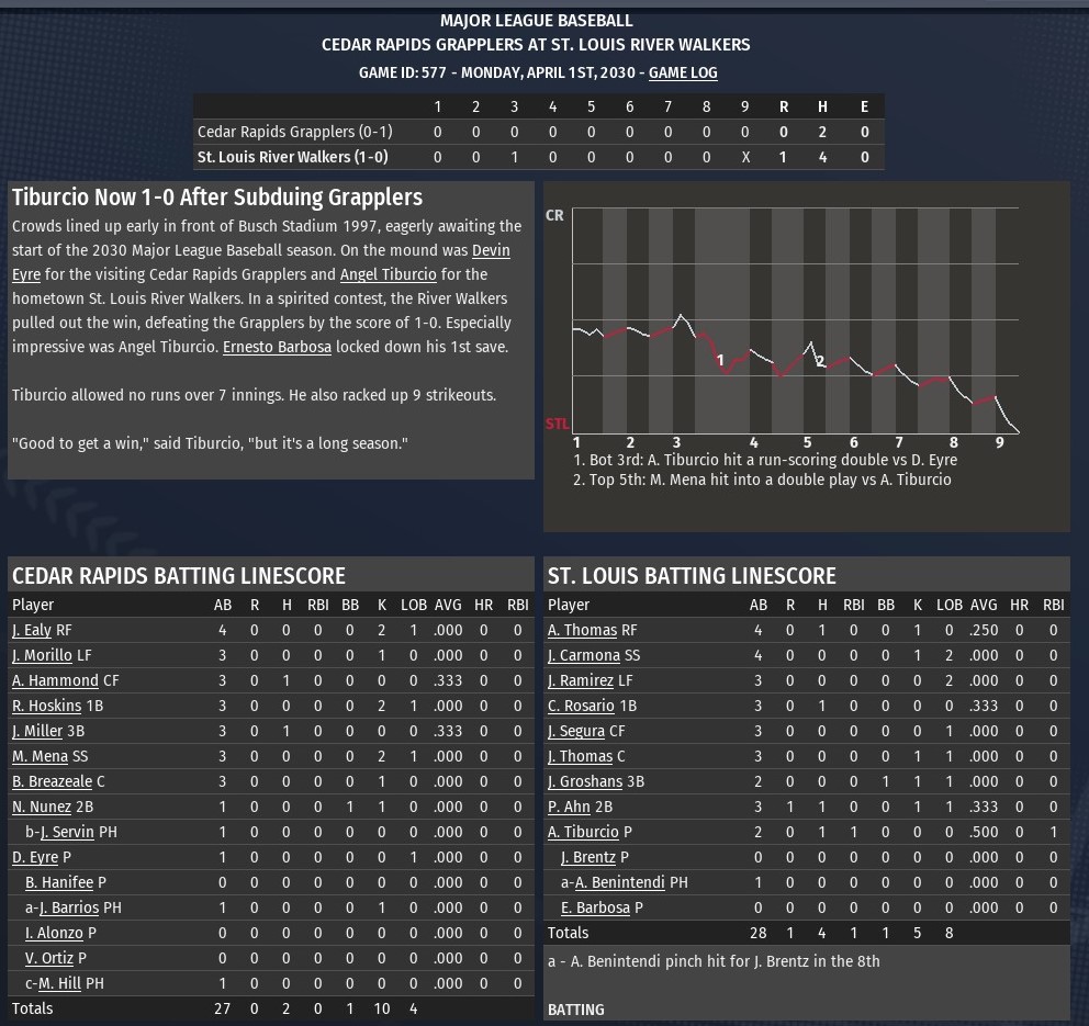 Angel Tiburcio pitched seven shutout innings and drove in the game's only run as St. Louis opened its season with a 1-0 win over Cedar Rapids at Busch Stadium (1997). The 2029 NL Cy Young winner, Tiburcio (1-0) allowed just two hits during his time on the mound. He struck out nine and walked one. He also came through at the plate when he hit the backend of consecutive doubles with Peter Ahn in the third inning off Grapplers startintg pitcher Devin Eyre. Ahn scored on the double. Jake Brentz and Ernesto Barbosa both retired all three batters they faced in the eighth and ninth, respectively. The save, of course, was Barbosa's first of the season. |