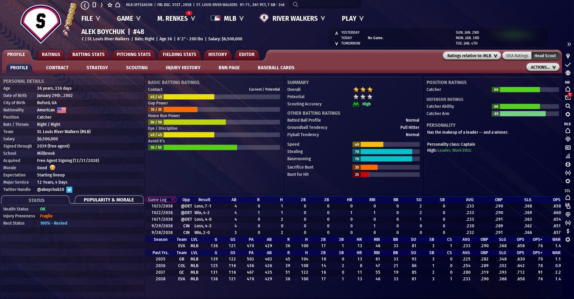 A four-time Gold Glove winner, the last coming in 2034 when he was in Green Bay, spent the 2038 season with Evansville. In 136 games (121 starts) with the Bosses, he hits .233 with 13 homers and 46 RBIs. Boychuk broke into the majors in 2026 with Chicago and played with the G-Men until 2029 when he was traded to Green Bay. After that, he played with the Mallards until 2035. The last three years it has been one season each at Columbus, Quad City and Evansville. For his career, in 1,388 games (1,261 starts), Boychuk has hit .241 with 146 home runs and 543 RBIs. |